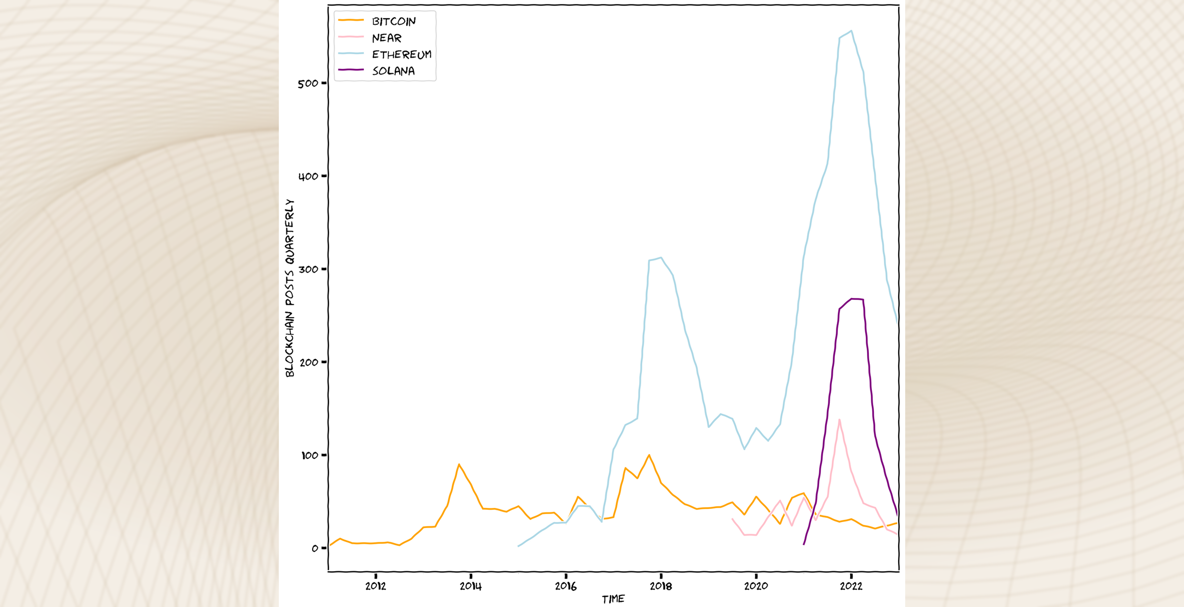 - We also can see spikes around the launches of Bitcoin and Ethereum communities, when the community was small and consisted only of domain experts.