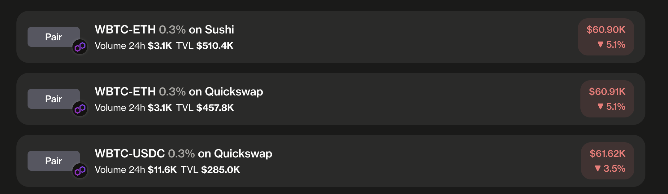 For example, Polygon WBTC liquidity on Quickswap has gone down 90% this summer.