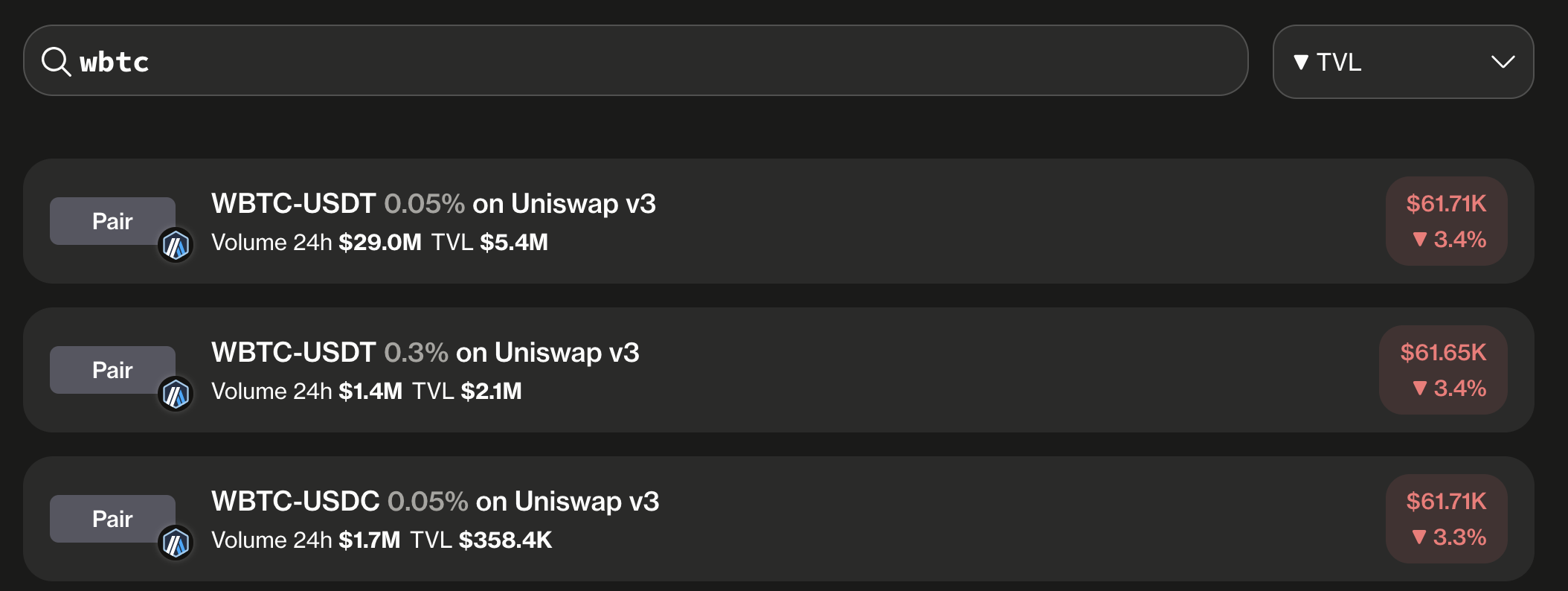 Meanwhile, Arbitrum has deep Uniswap V3 CLMM liquidity for the WBTC-USDT pair with a cost-efficient 5 BPS trading fee.