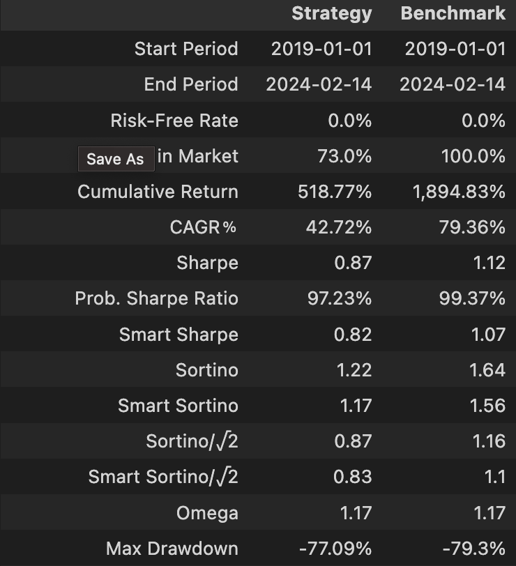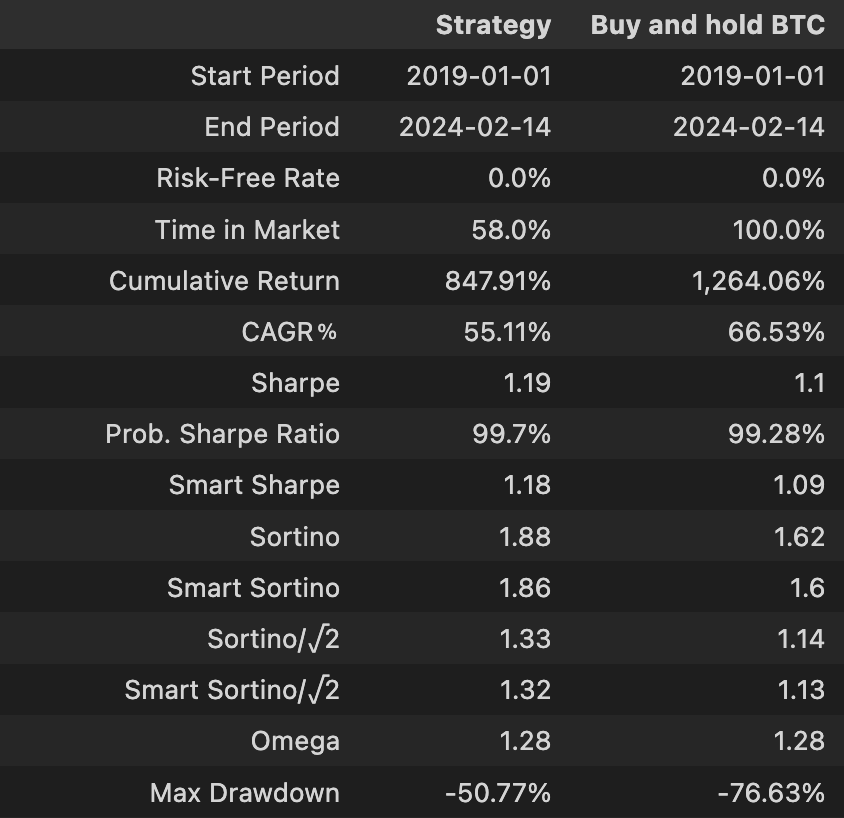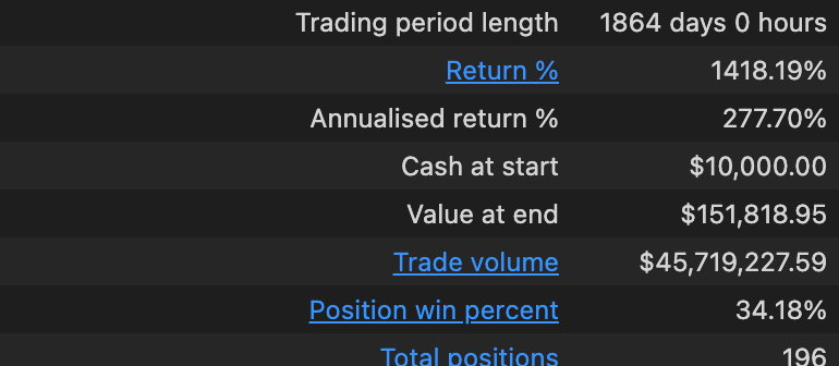 - Transparent and auditable: Because the strategy is simple and lacks any machine learning magic, it’s easy to understand why certain trades were made and what effects the performance.
