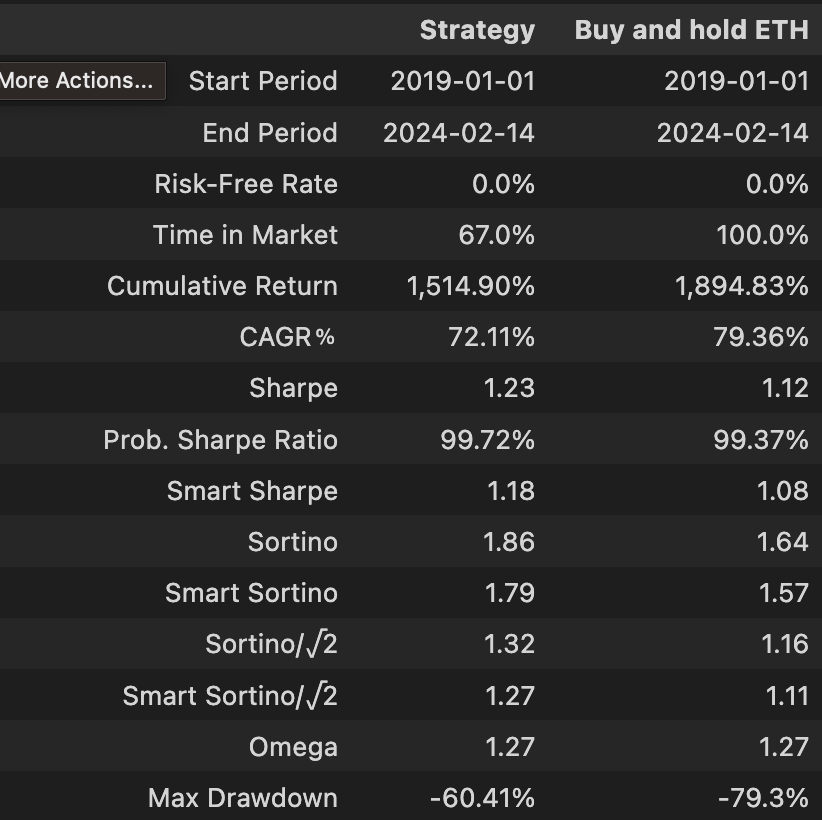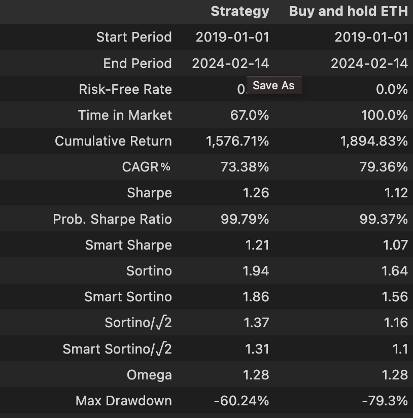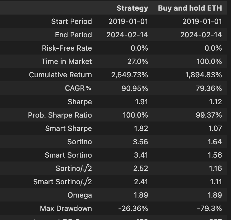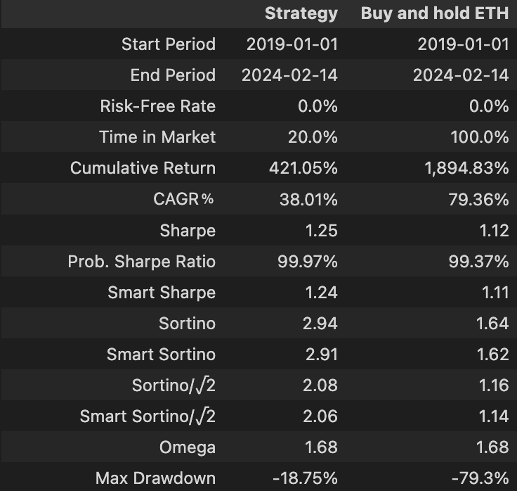 Then, we want to outperform ETH in a risk-adjusted manner (4). Here, risk-adjusted means that our portfolio's maximum drawdown is less than the maximum drawdown of buy-and-hold ETH, even if we end up with less profit. The usual way to compare risk-adjusted portfolio performance is the Sharpe ratio, although more is needed to get a whole picture.