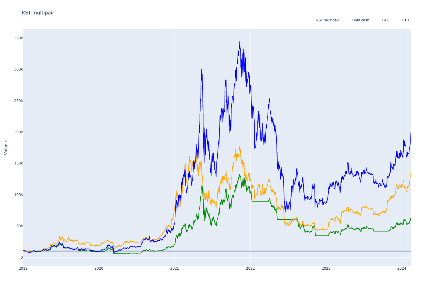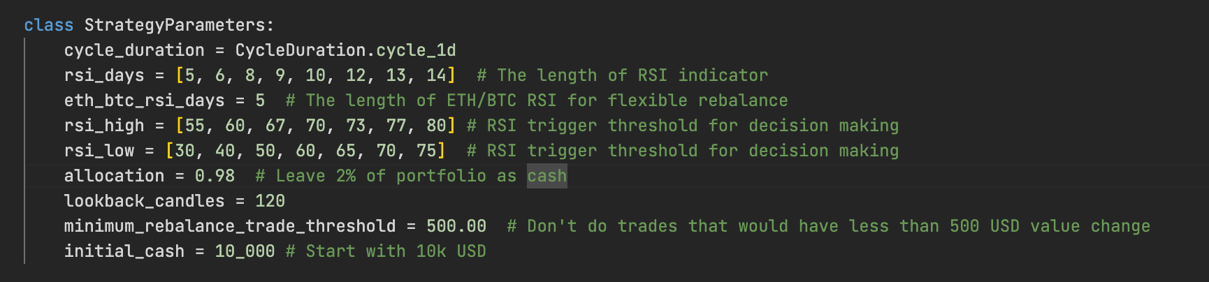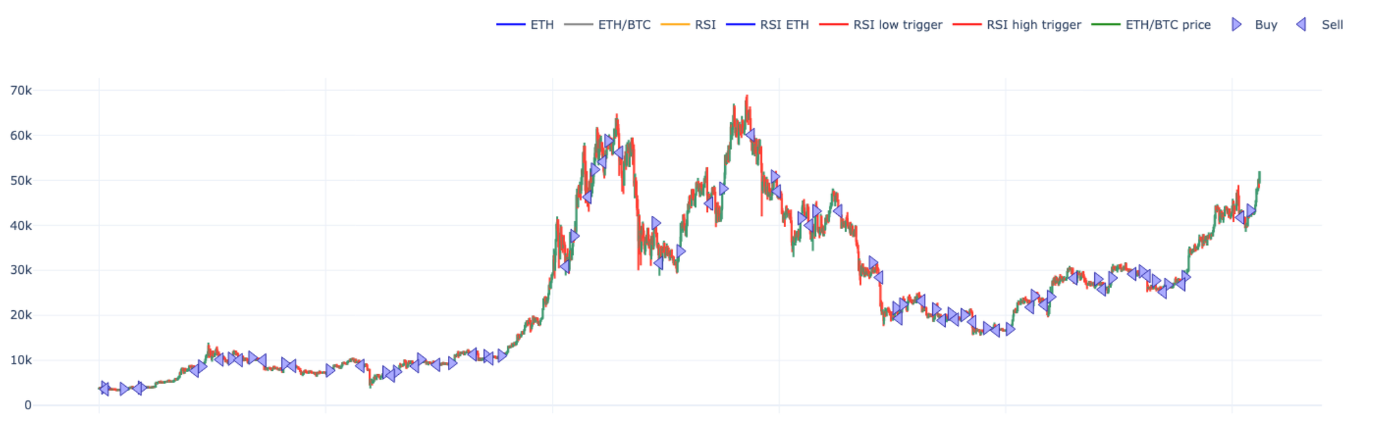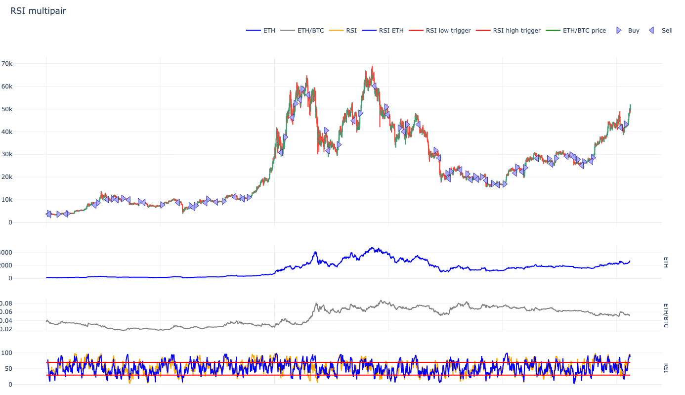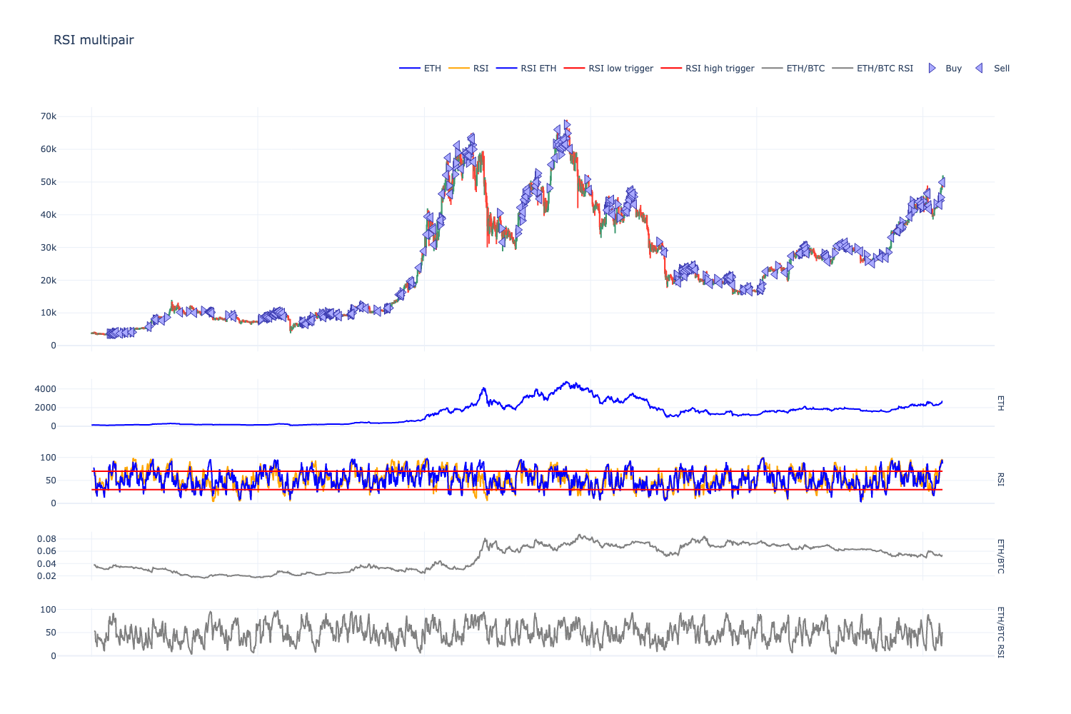 - Static parameters: There is no feedback loop to adjust the parameters for market conditions like bull and bear markets (often called market regimes). We use the same RSI threshold values for BTC and ETH, even though we see that it might be beneficial to have per-pair thresholds due to their different price action characteristics.