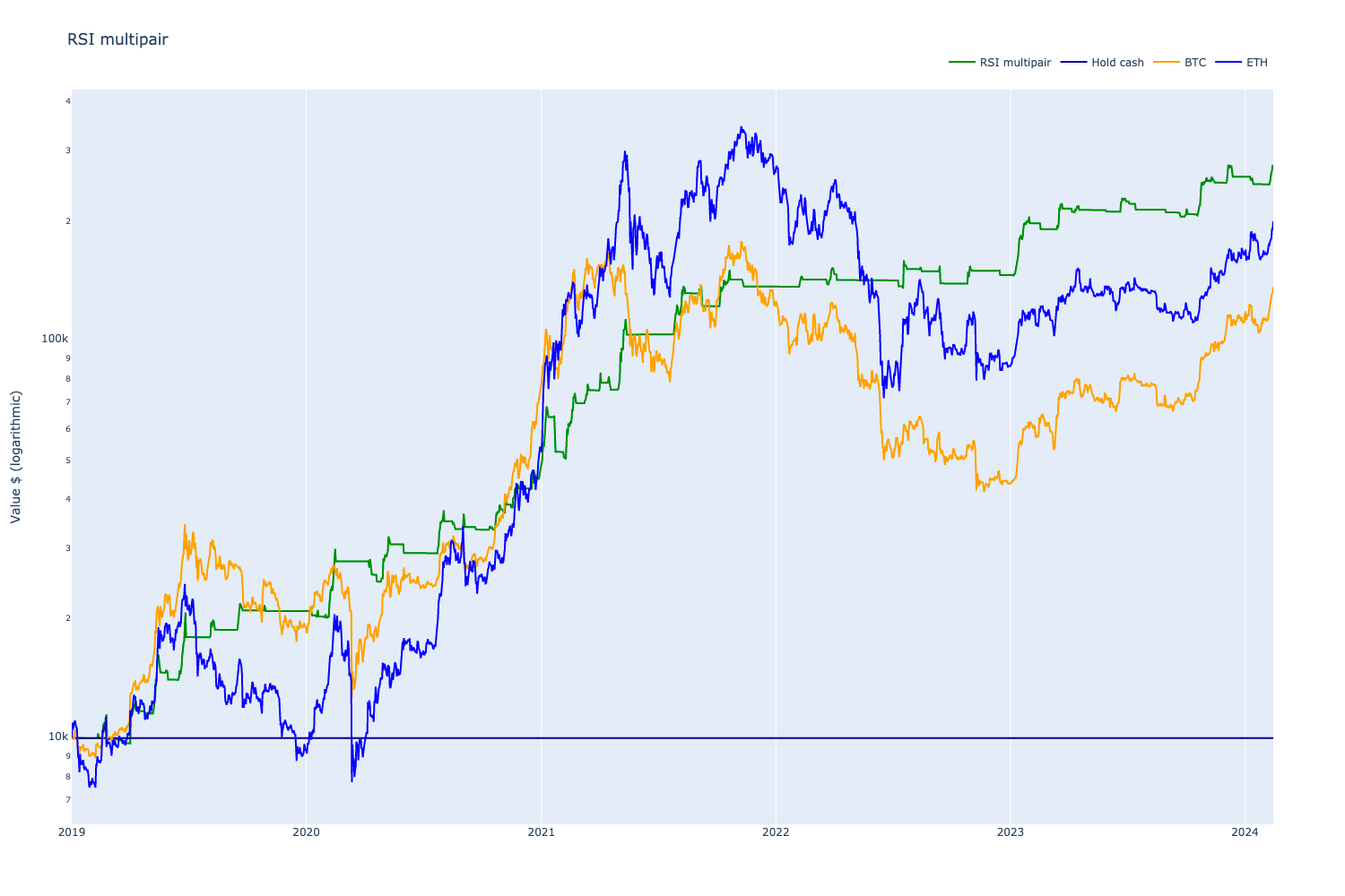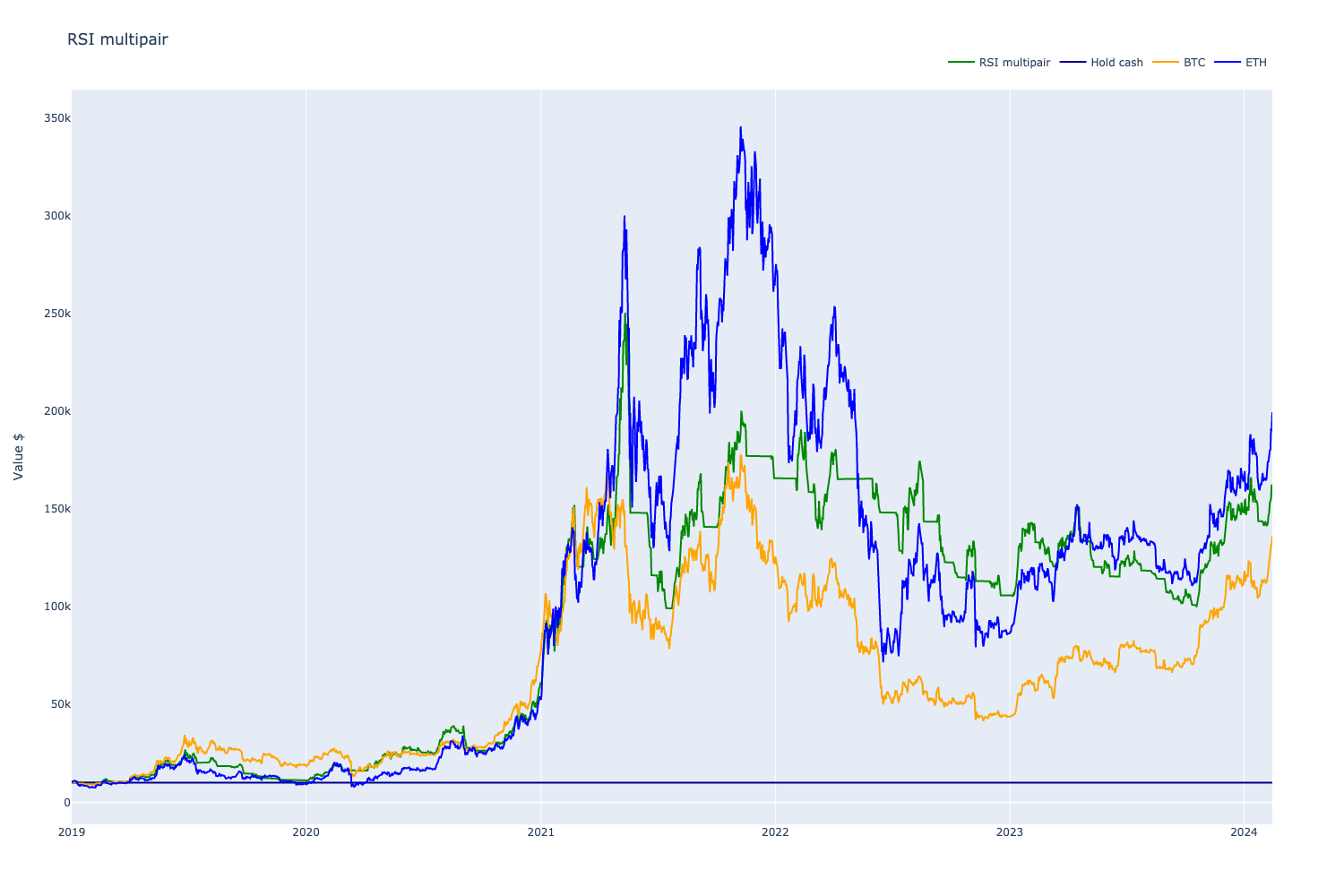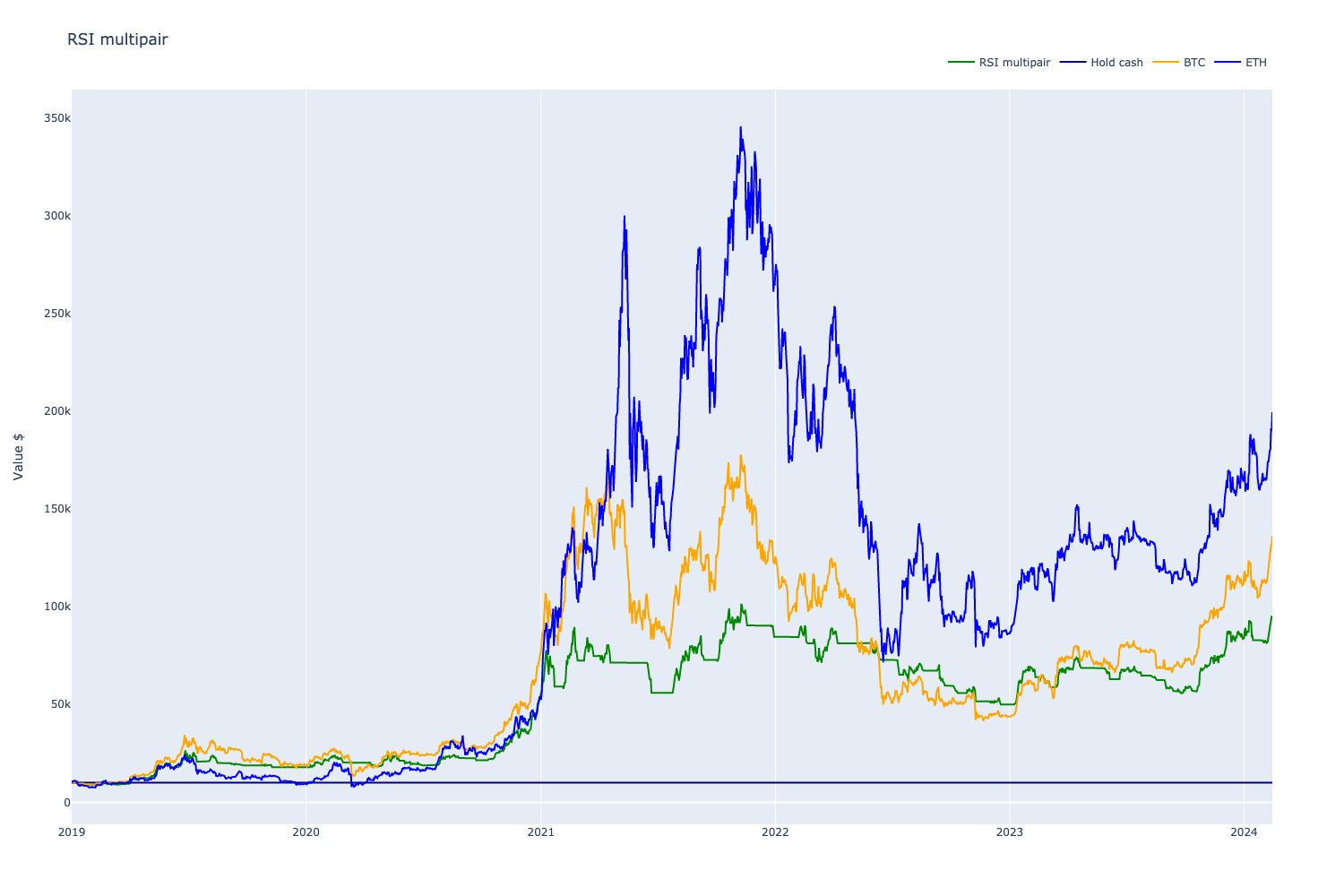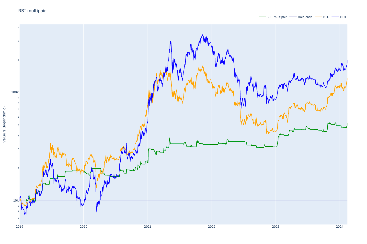 - Static parameters: There is no feedback loop to adjust the parameters for market conditions like bull and bear markets (often called market regimes). We use the same RSI threshold values for BTC and ETH, even though we see that it might be beneficial to have per-pair thresholds due to their different price action characteristics.