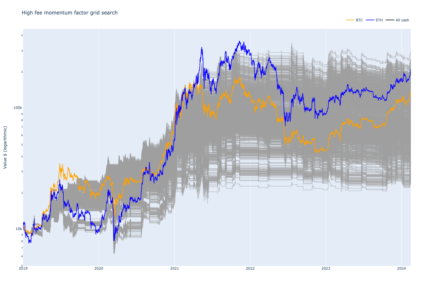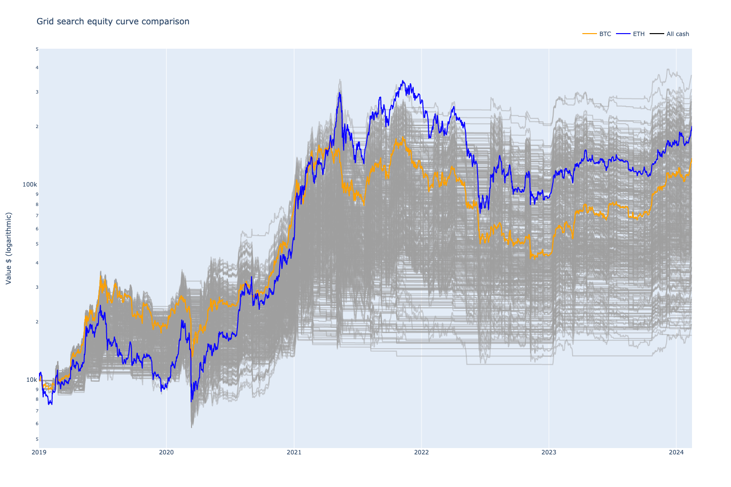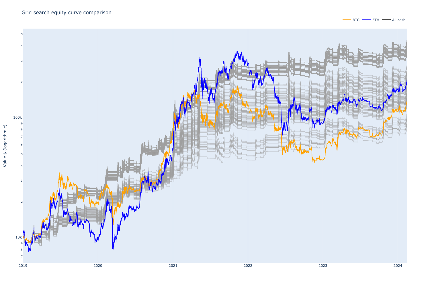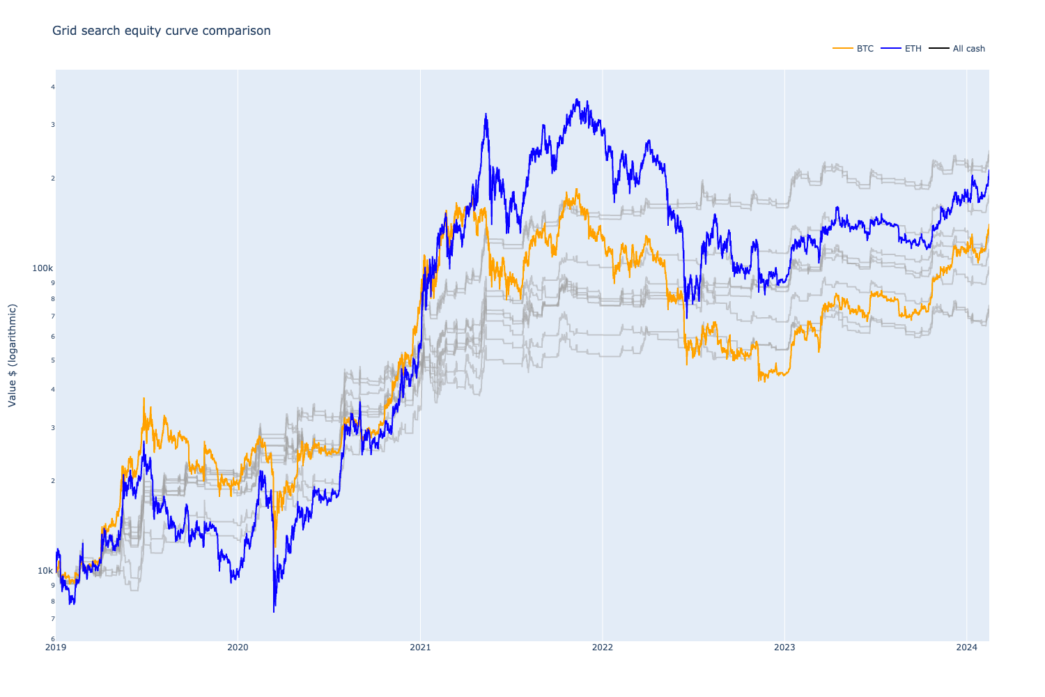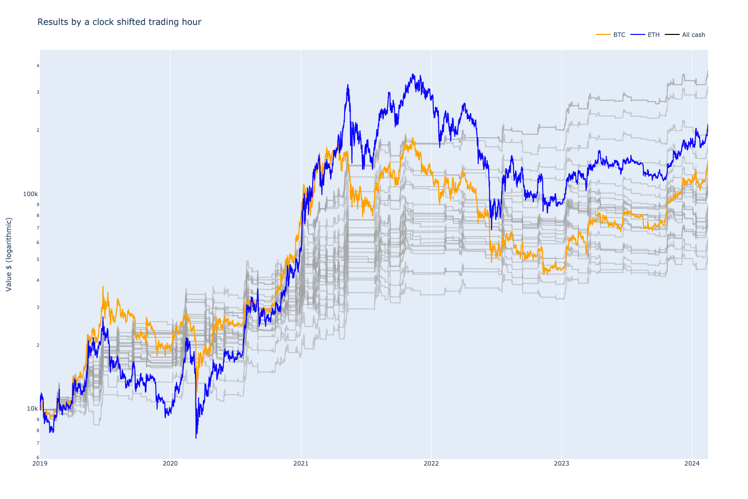 The best-performing 00:00 equity curve outperforms ETH, both absolutely and risk-adjusted, using grid-searched parameters optimised for this historical data. Most equity curves land between buy and hold BTC and ETH profit, but the drawdown is much more modest -20% to -35% compared to 70% and 80% drawdown with buy and hold.