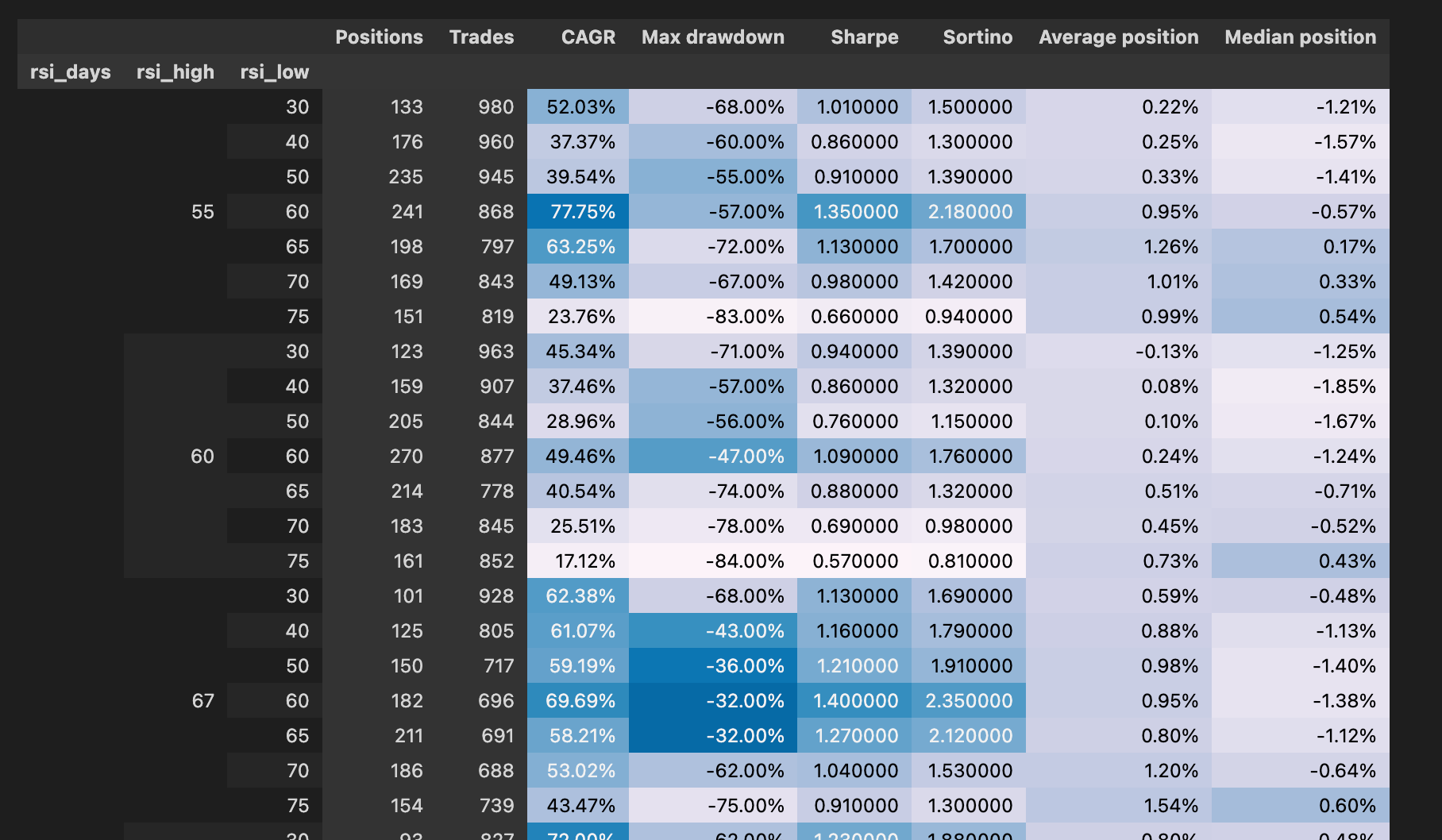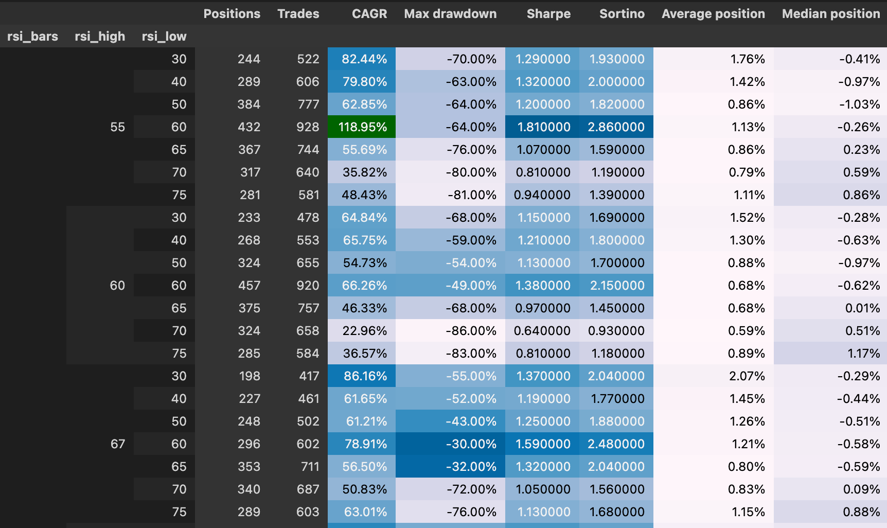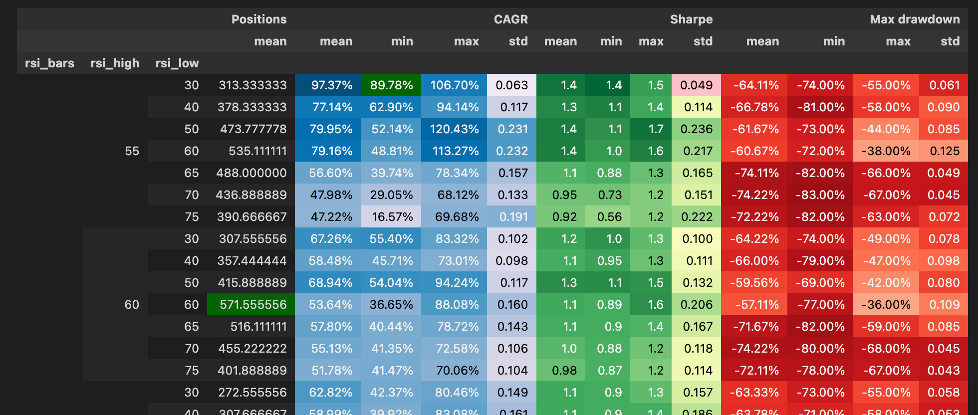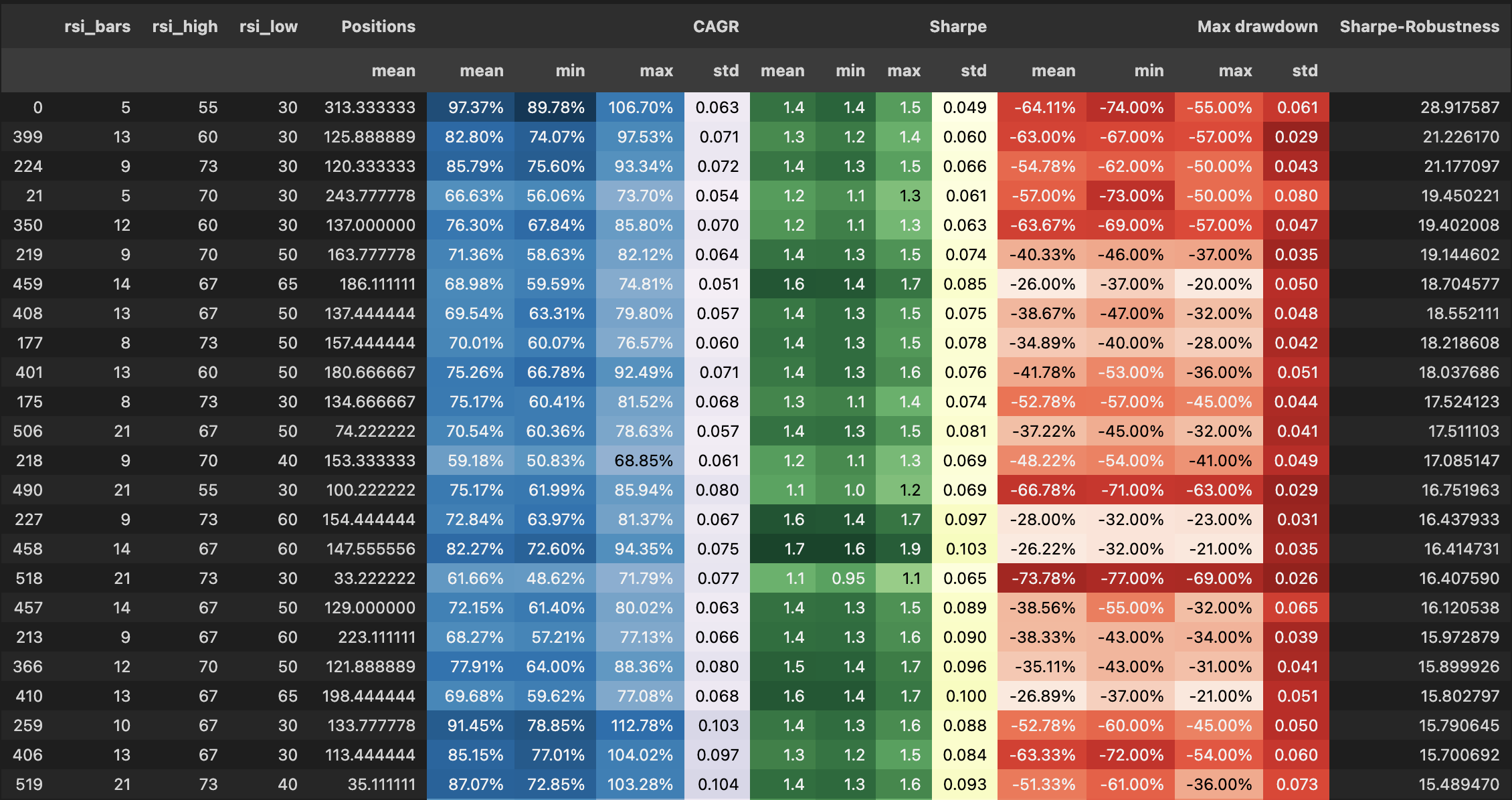 We do this by getting standard deviation (std), min, max, and mean for each RSI parameter combination, as well as all candle-shifted results. The results are then presented in a gradient table. If the Sharpe number is high and the gap between minimum Sharpe and maximum Sharpe is tight, it means the strategy should have more predictable performance characteristics.