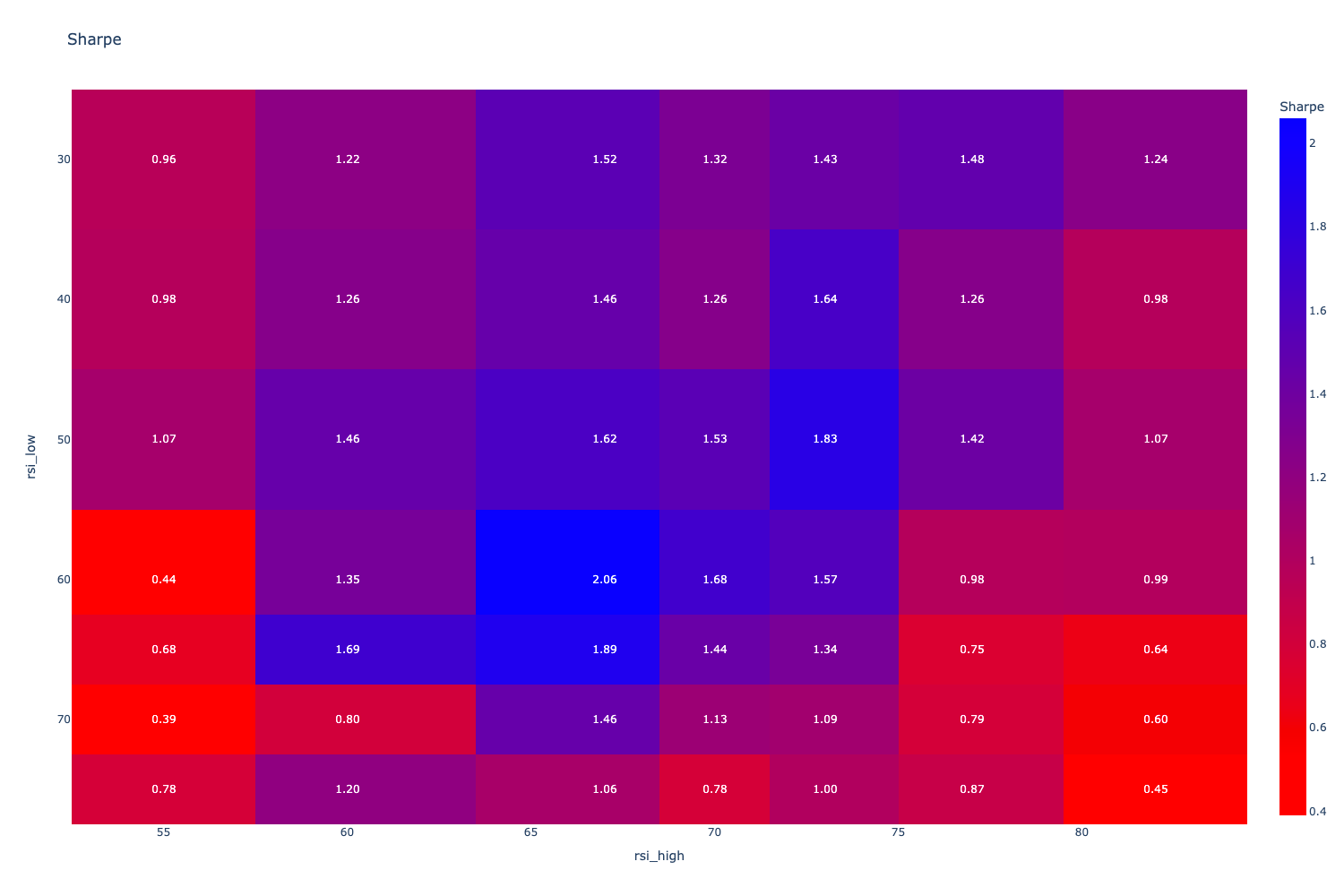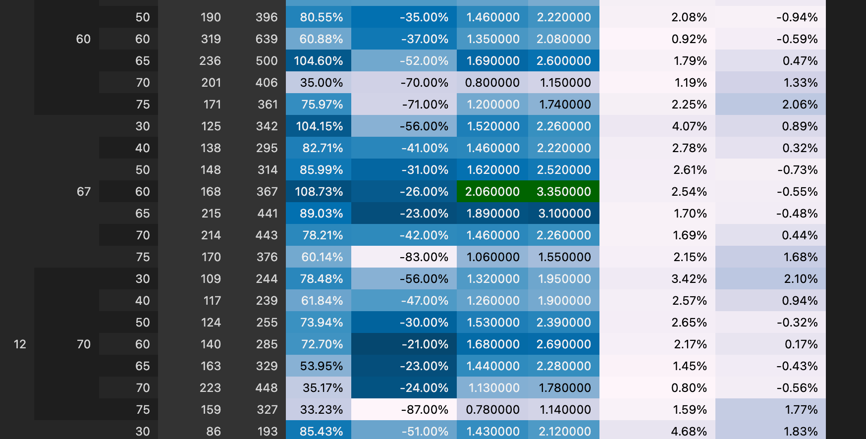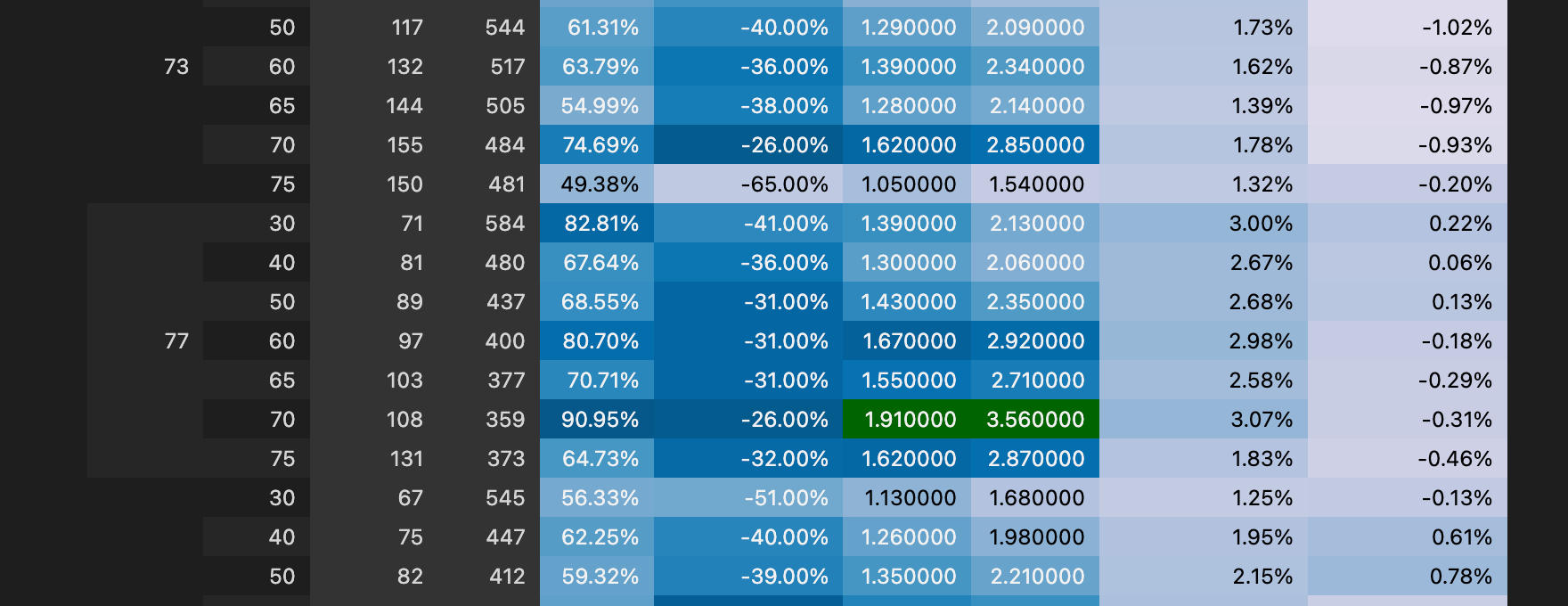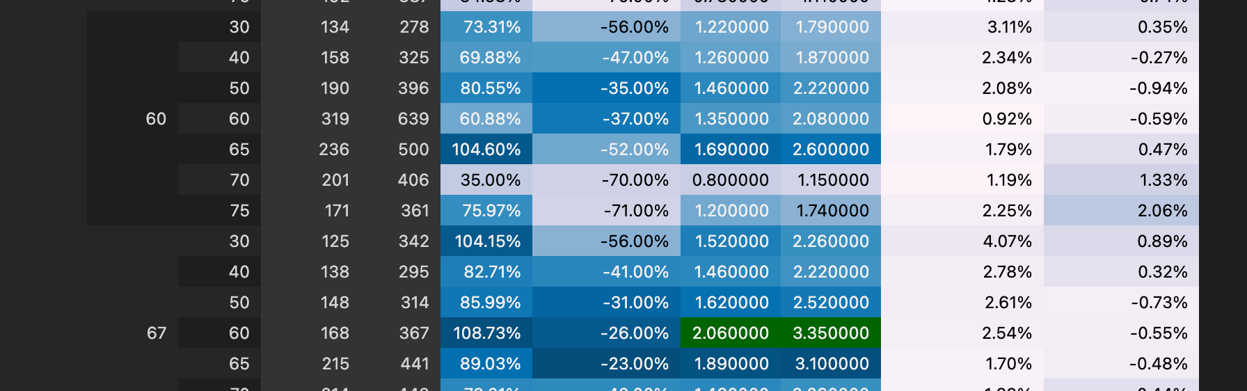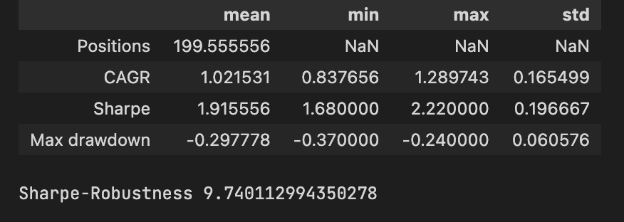 We do this by getting standard deviation (std), min, max, and mean for each RSI parameter combination, as well as all candle-shifted results. The results are then presented in a gradient table. If the Sharpe number is high and the gap between minimum Sharpe and maximum Sharpe is tight, it means the strategy should have more predictable performance characteristics.
