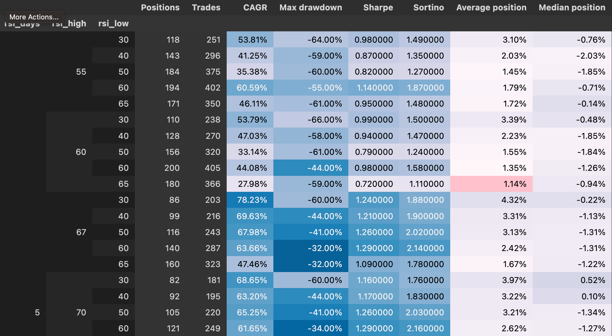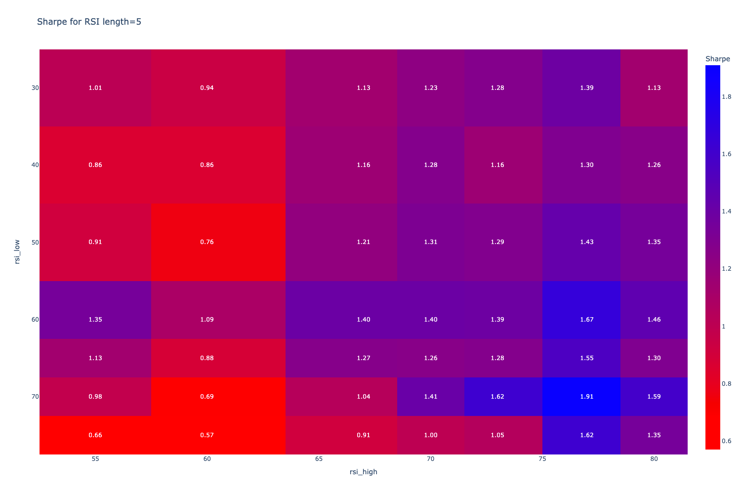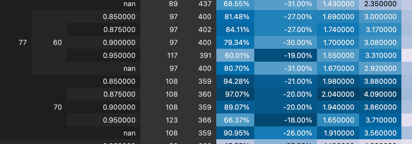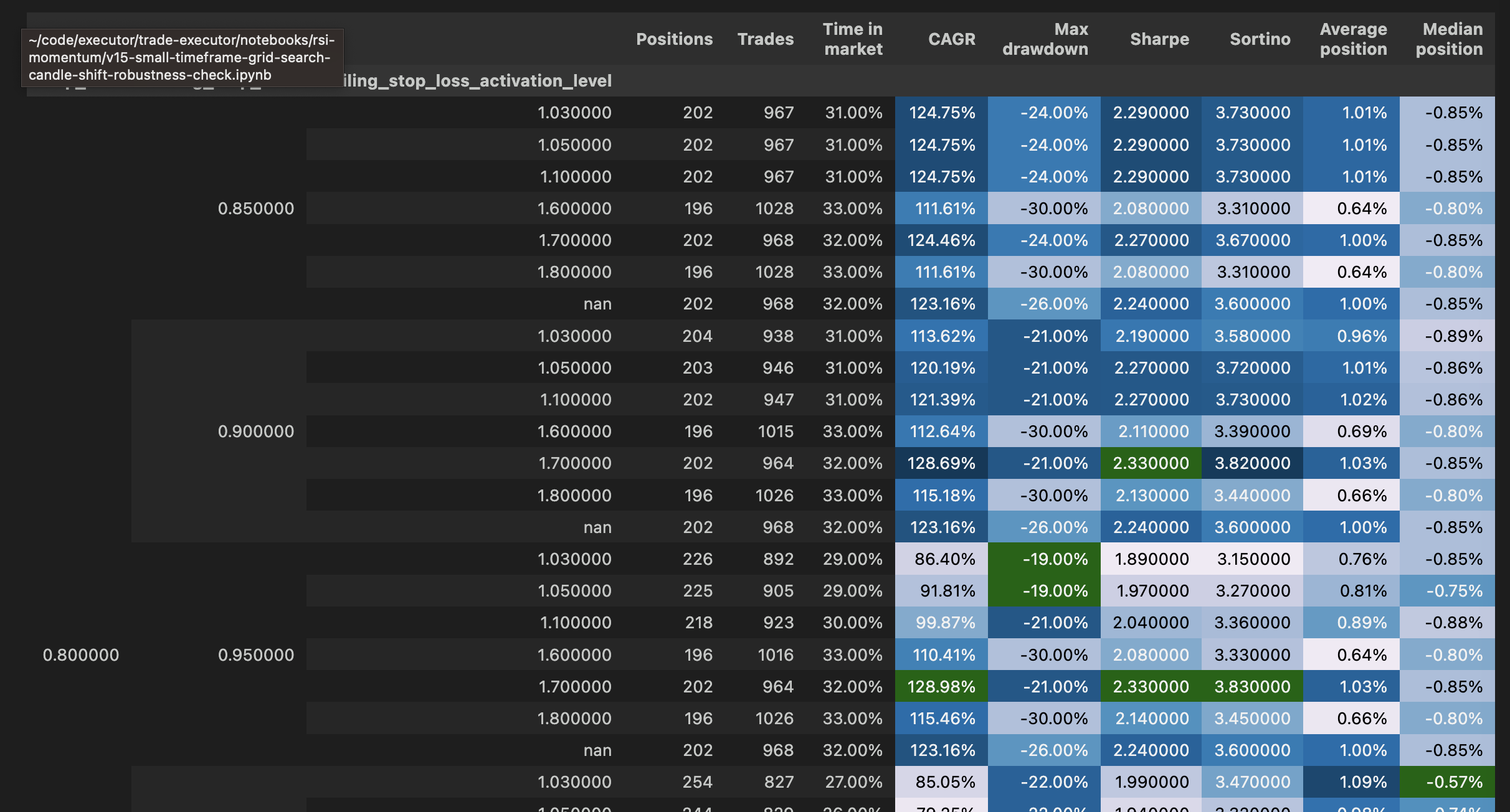 We do this by getting standard deviation (std), min, max, and mean for each RSI parameter combination, as well as all candle-shifted results. The results are then presented in a gradient table. If the Sharpe number is high and the gap between minimum Sharpe and maximum Sharpe is tight, it means the strategy should have more predictable performance characteristics.
