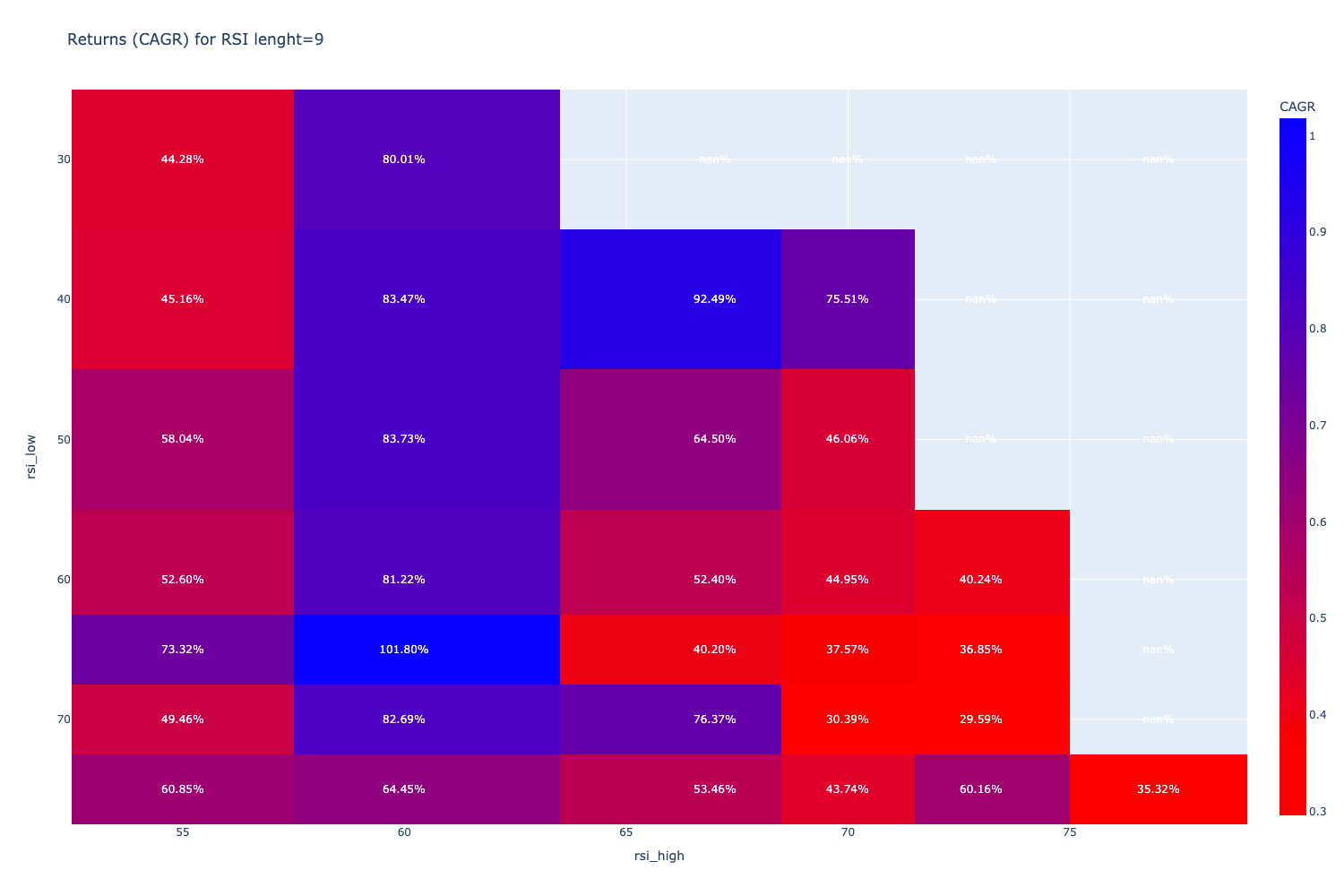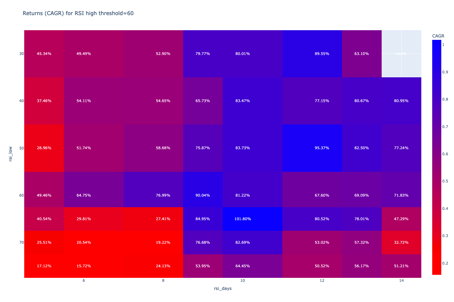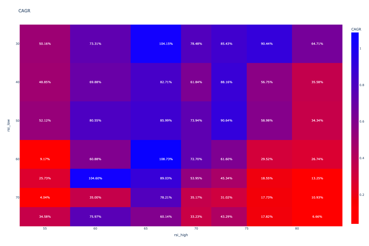 With this kind of grid search, we can compare the strategy performance of each RSI parameter combination, regardless of the starting hour: Are some RSI threshold level combinations more stable than others?