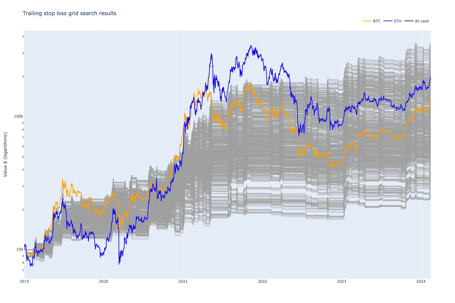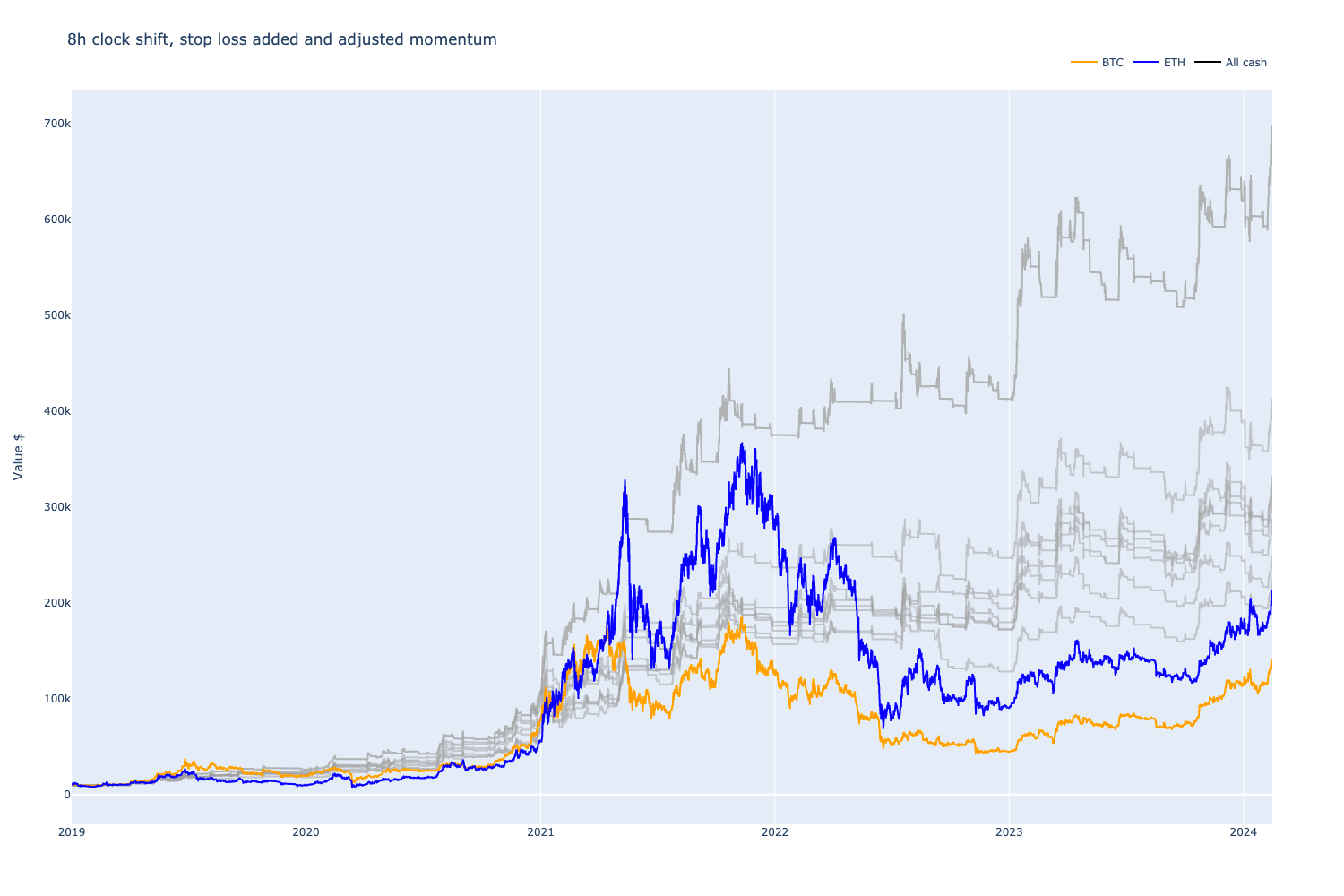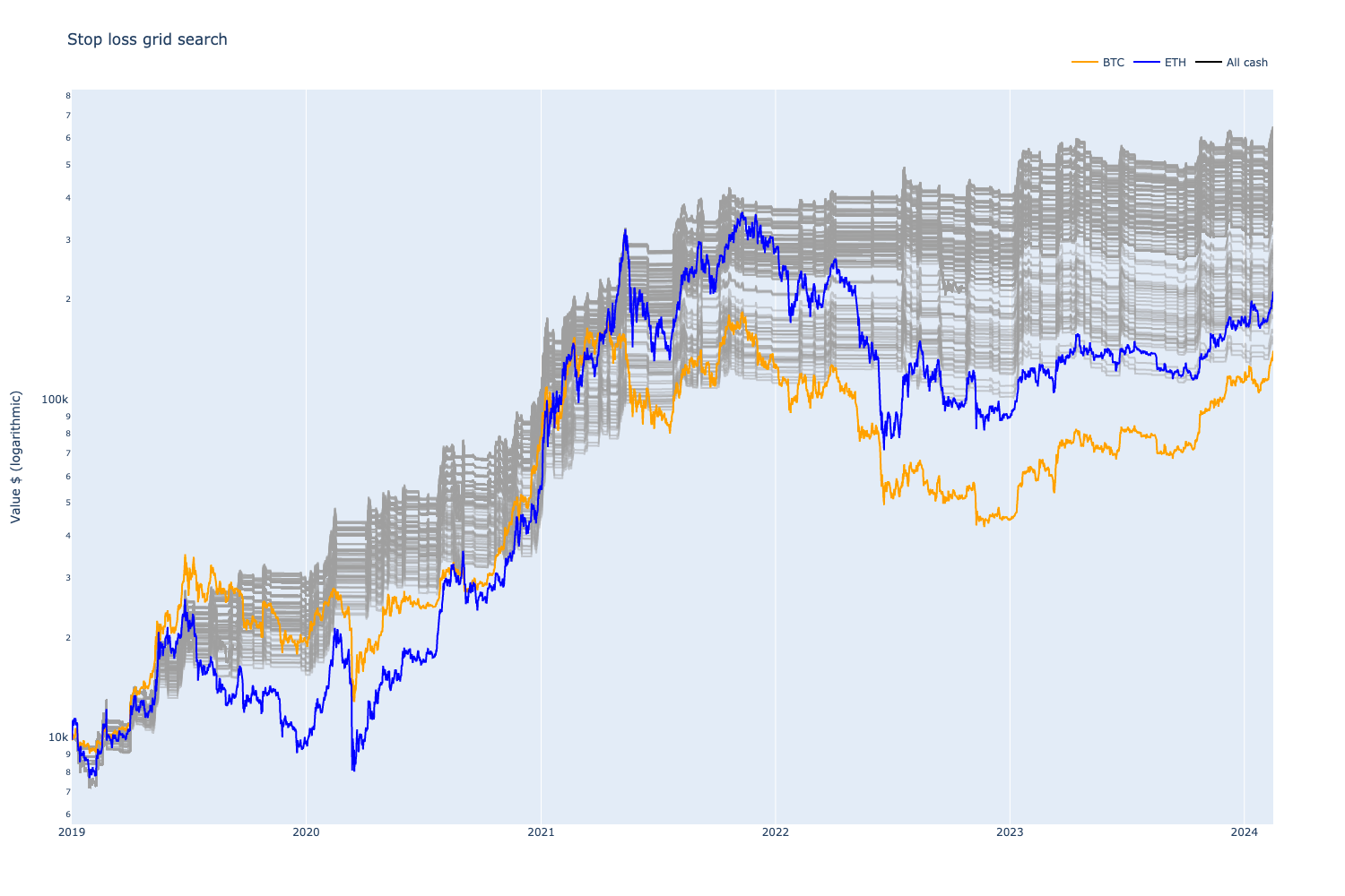 We searched for the various strategy parameters, including adding the stop loss. Some of the parameter combinations considerably outperform ETH.