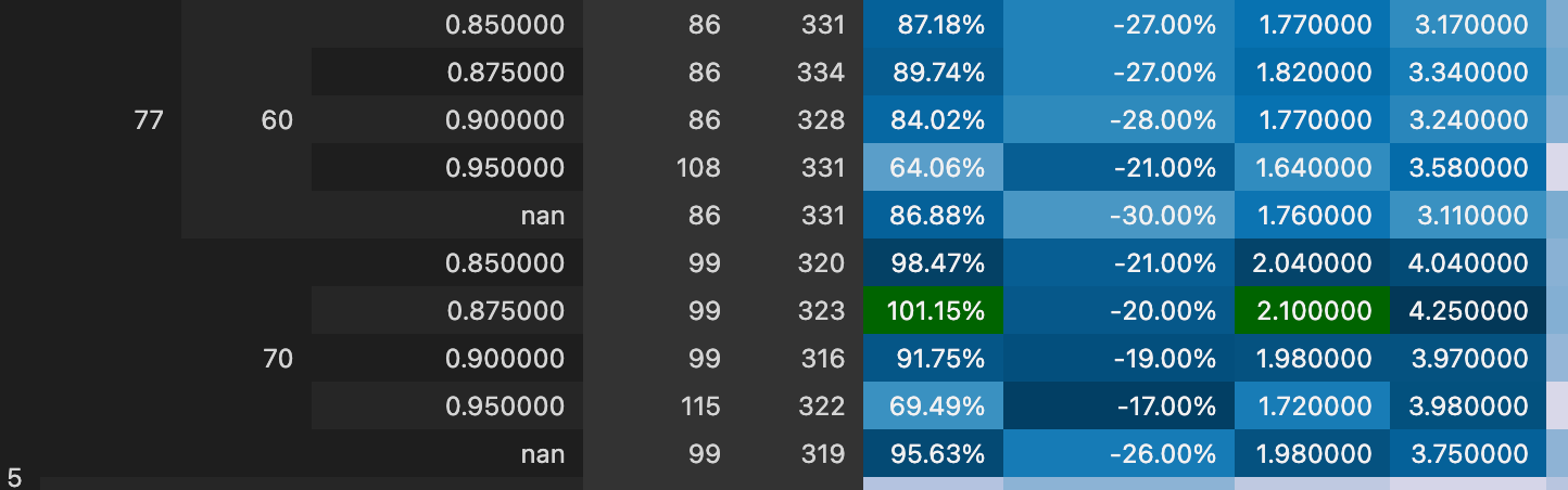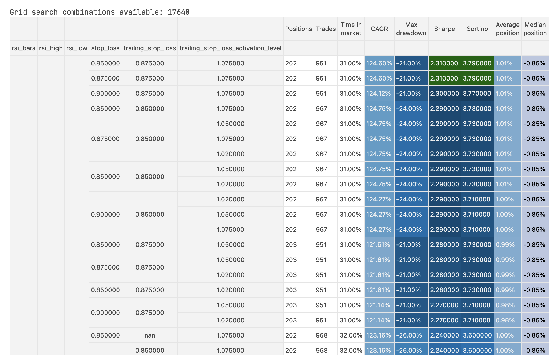 Note that we limited the search space here by searching fewer parameters than in the previous grid search. We also searched for the ETH/BTC RSI length parameter for the flexible alpha signal.
