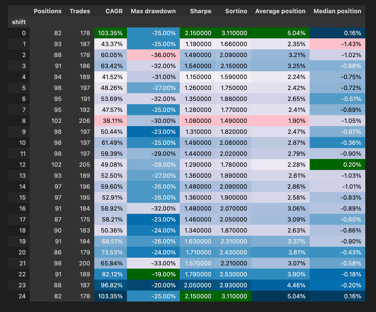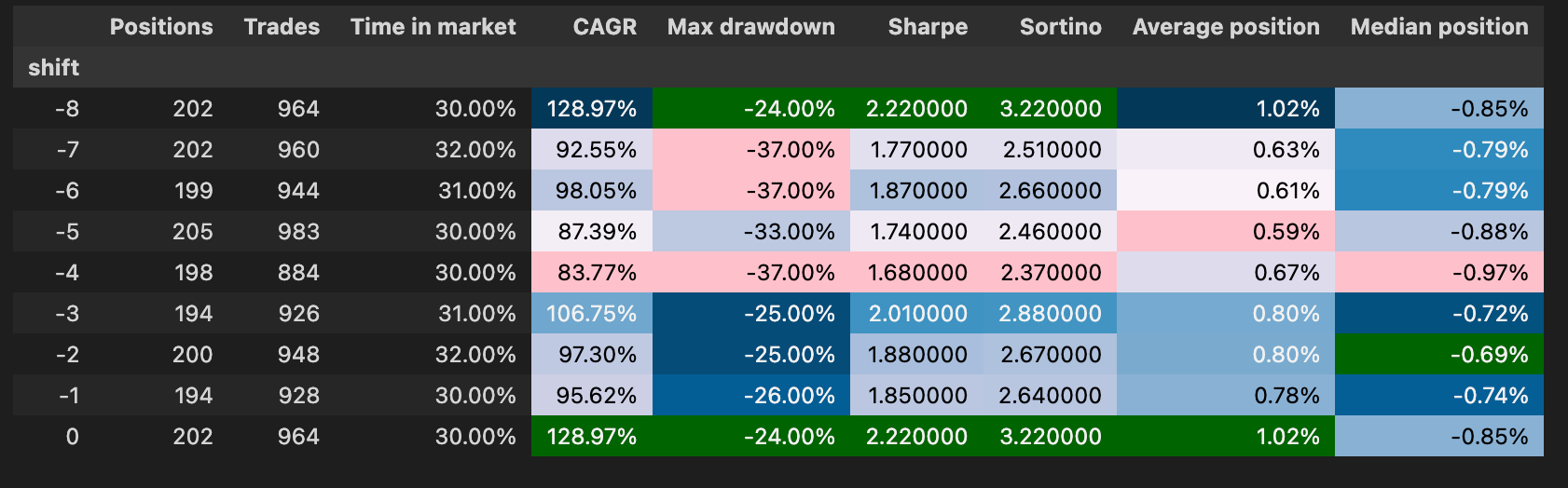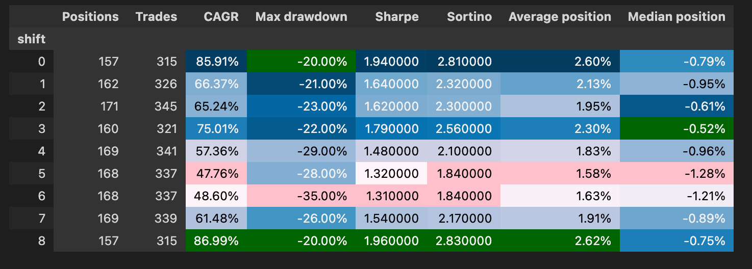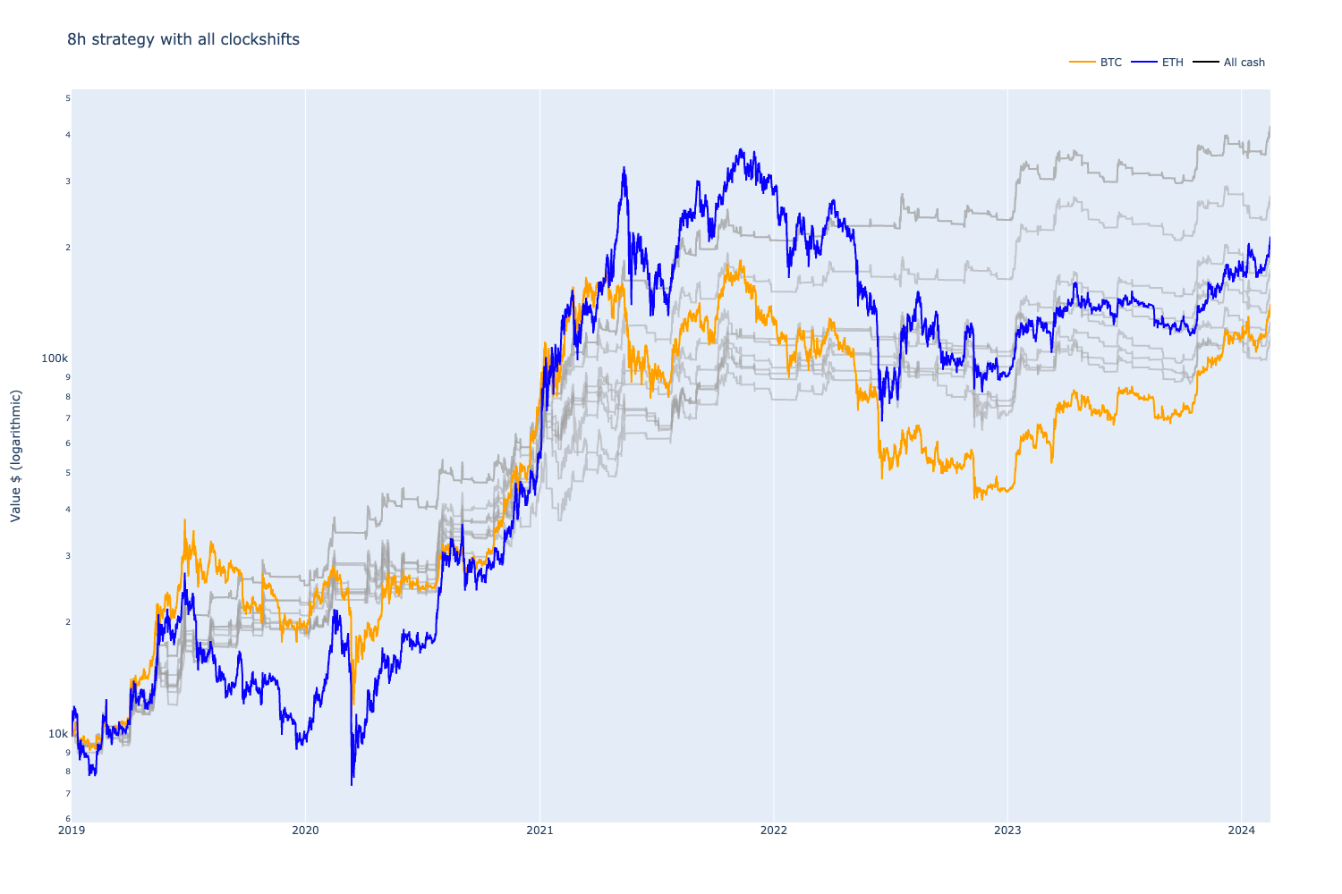 As with the daily candle strategy, we do a clock-shift test by shifting the 8h candle starting trading hour between 00:00–08:00.