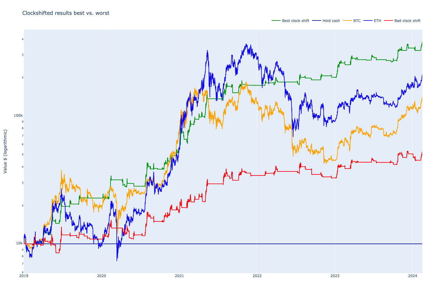 We further check for overfitting by doing a time-shifted grid search by shifting the price candle start hours around.