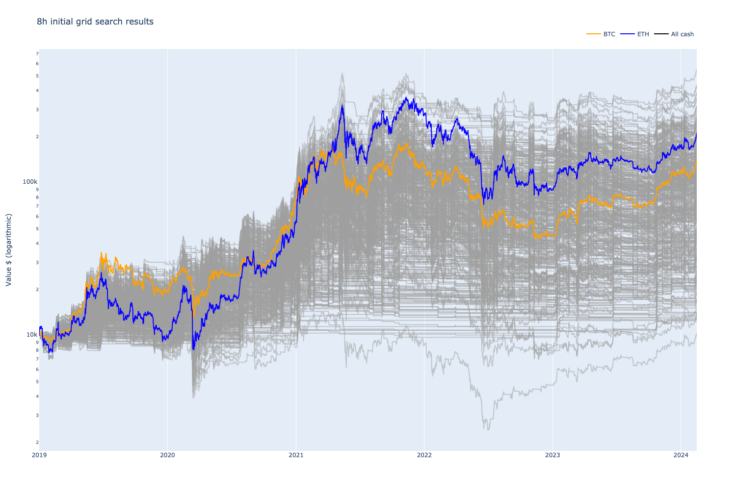 We completed > 10,000 parameter combination searches over a larger 8h candle search space. This did not give us any new findings compared to earlier.