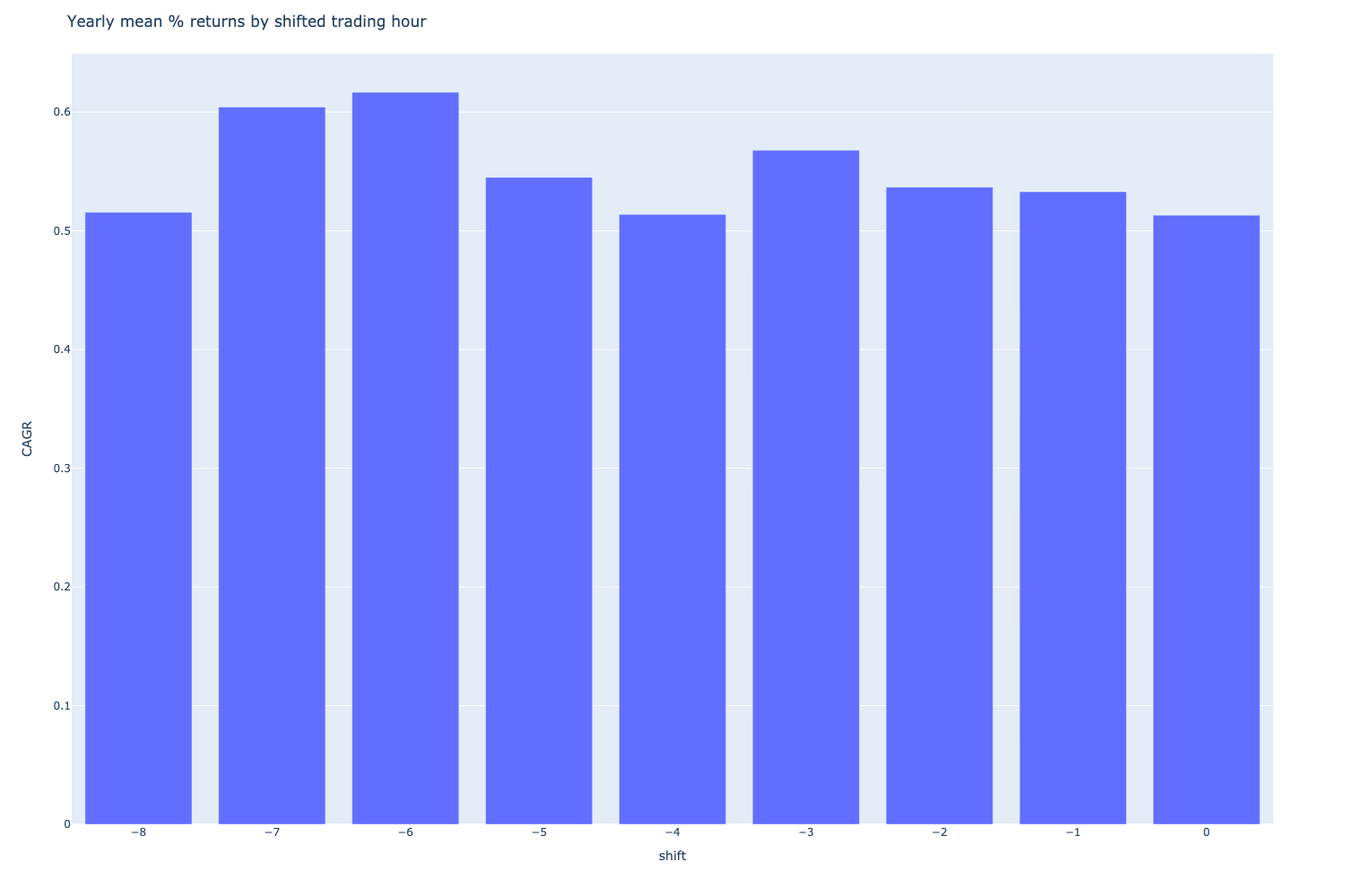 Overall, the variance in the performance is too wide, and further research is needed. Either the strategy is overfitted (likely as there are only ~17 positions per year), something is wrong in our backtest set-up (less likely but possible as this is not a much-explored topic), or we do not understand the market microstructure (something magical going on with certain trading hours).