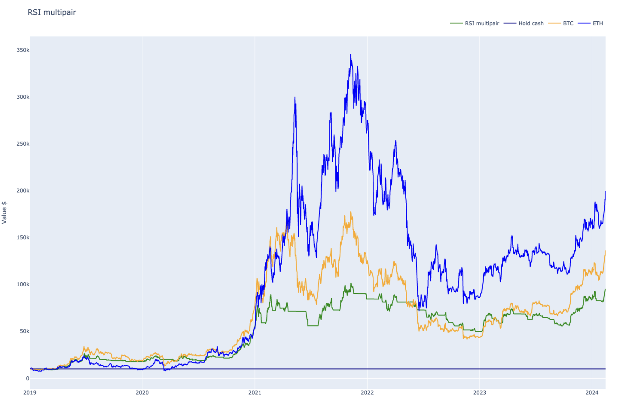 - Simple risk management: When trading spot only, one cannot get liquidated. Maximum capital at risk is at the level where the price falls under the RSI exit threshold. We also explore explicitly setting stop loss parameters.