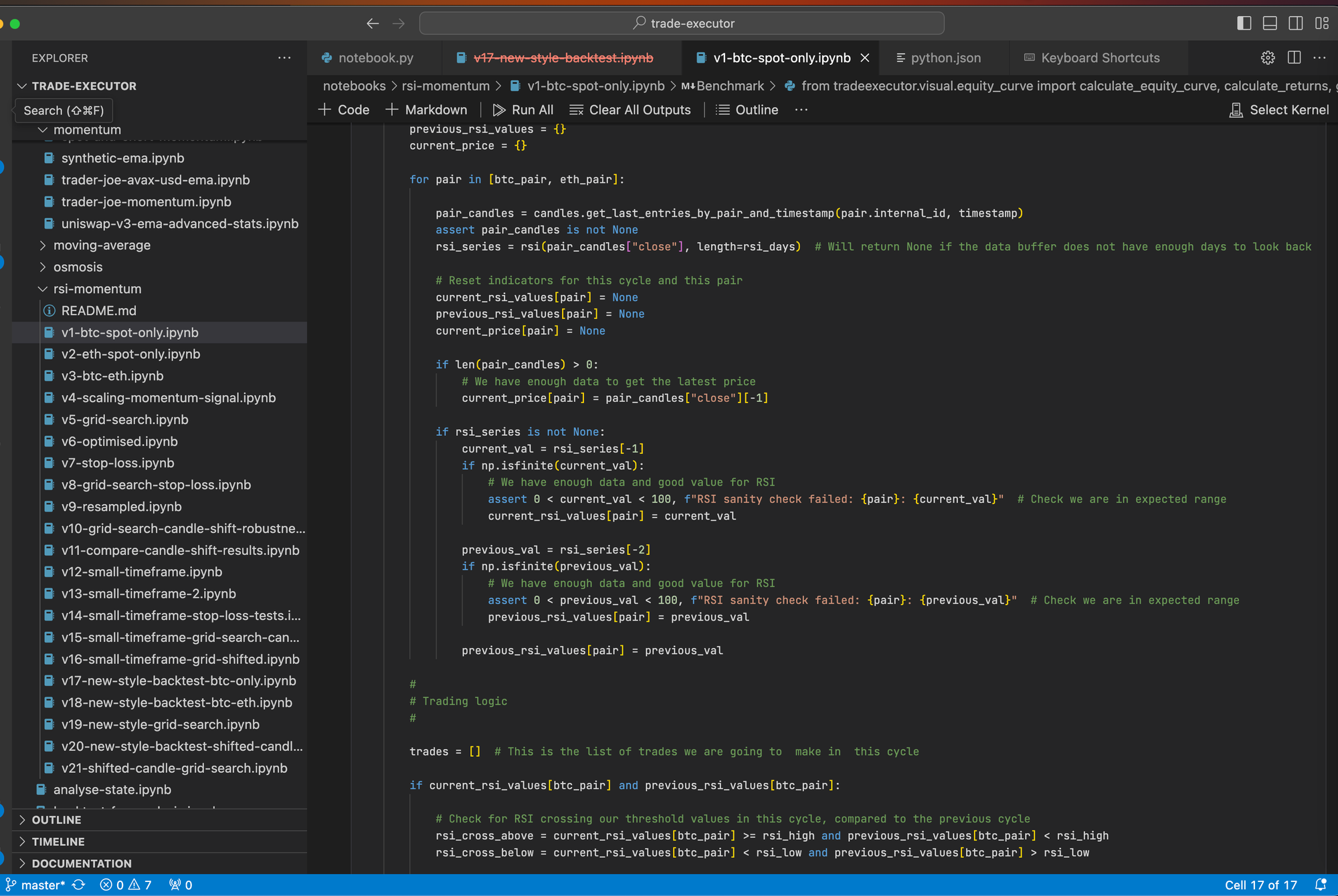 We directly link different notebook versions on GitHub. Each notebook explores different aspects of strategy development. GitHub fails to render the notebooks perfectly and lacks important formatting like colour gradients on the tables. For the best reading experience, open these notebooks in a local Visual Studio Code editor.