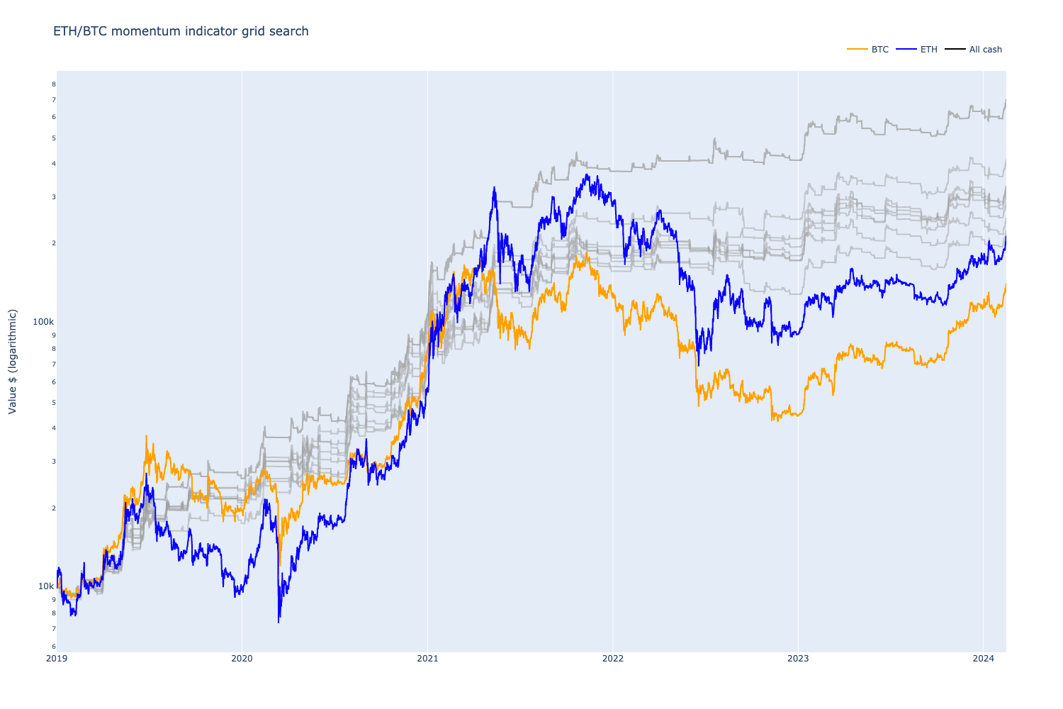 - ETH/BTC Momentum: RSI 3 bars, 2.5 exponent adjustment