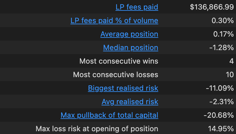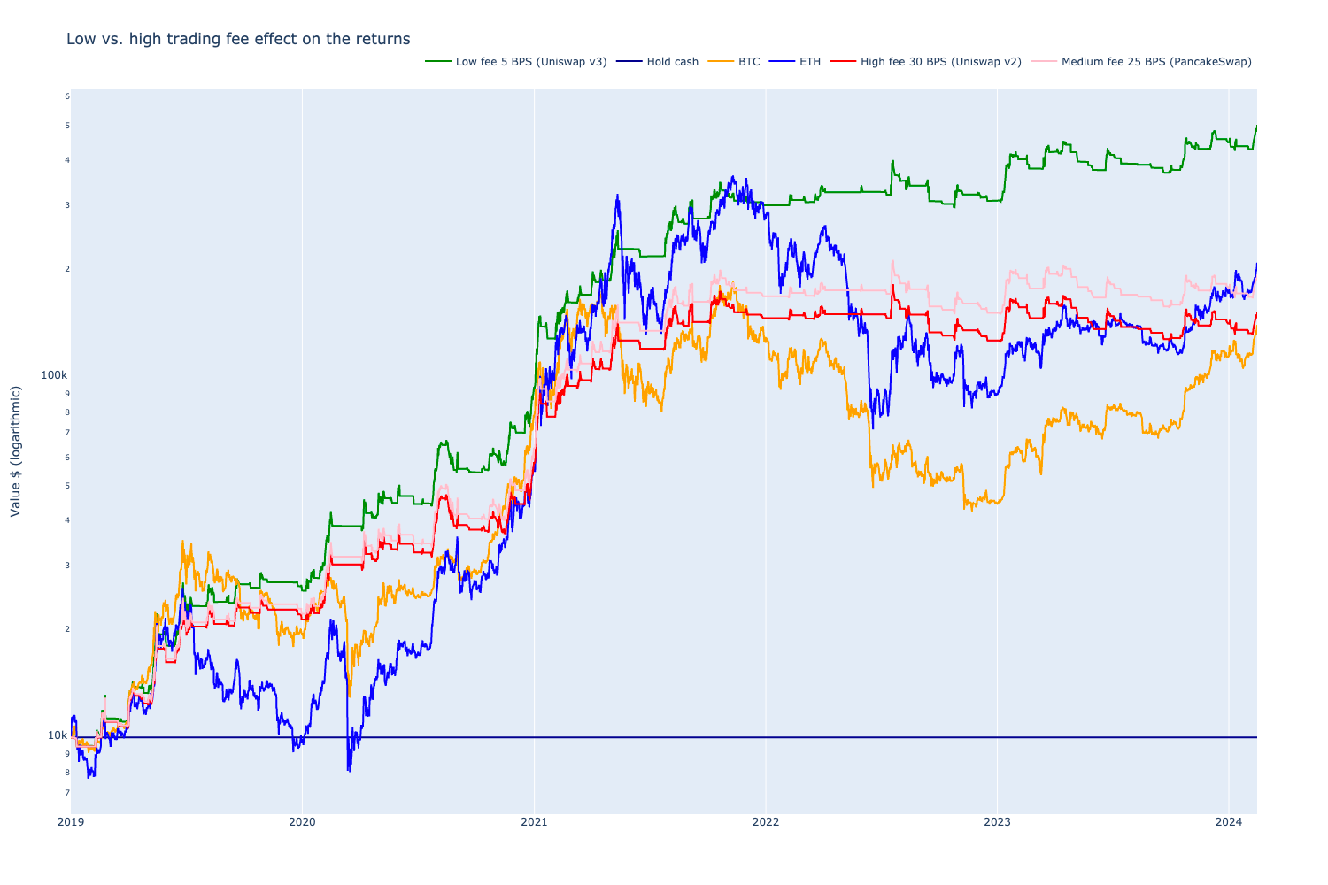 The above backtests were done using a 5 BPS taker fee without price impact. In decentralised finance, some common fee tiers include