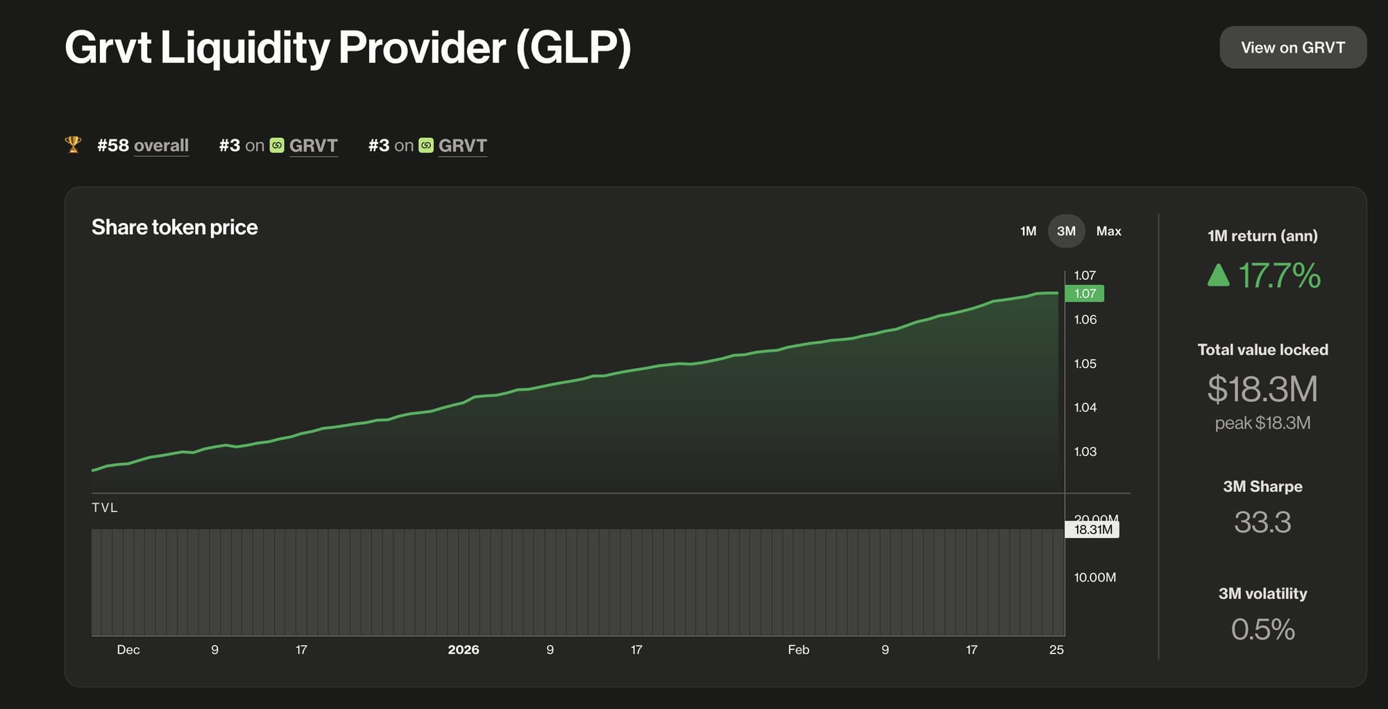 You can now benchmark perpetual futures DEX native trading vaults against EVM DeFi vaults. The flagship vaults of both perp DEXes are their in-house market-making vaults. HLP for Hyperliquid and GLP for Grvt.