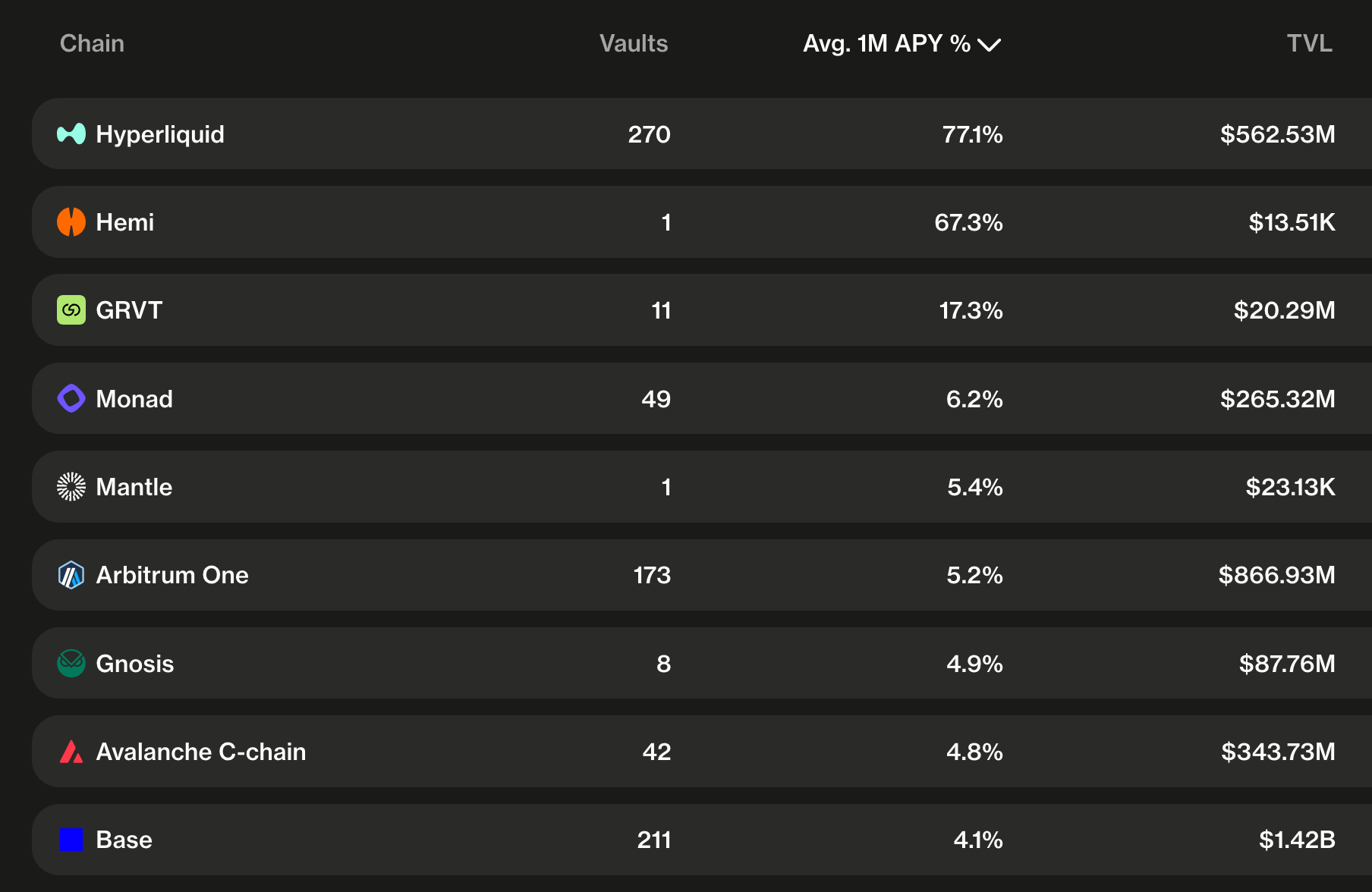 The breakdown of vaults by their blockchain is available. Currently, Hyperliquid native vaults dominate with 50% annual returns based on their one-month TVL-weighted returns, mostly driven by higly profitable liquidations by HLP.