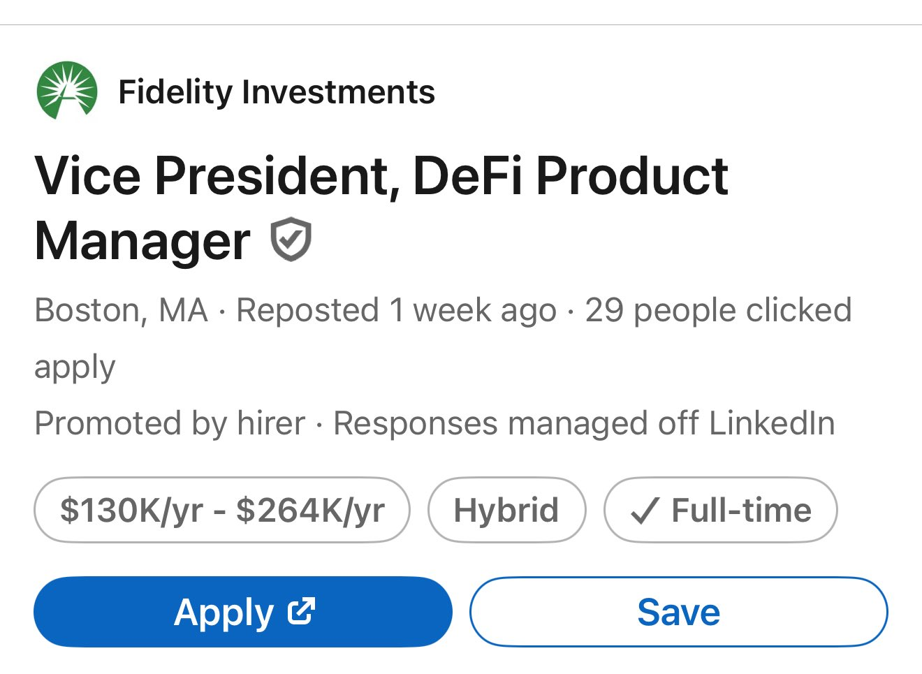 Fidelity's hiring of a Vice President, DeFi Product Manager is significant as it shows a traditional finance giant advancing into decentralised finance. The role focuses on designing and scaling institutional-grade DeFi products, including on-chain vaults, structured strategies (yield, carry, delta-neutral), protocol assessments, smart-contract architecture, tokenomics, oracle risk management, and portfolio curation—bridging TradFi and DeFi to drive mainstream adoption.