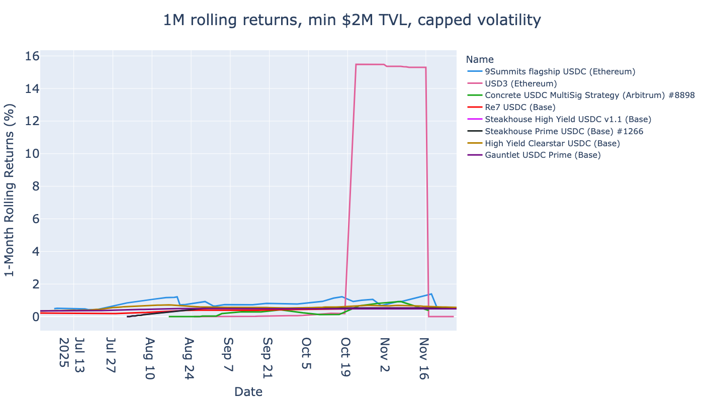Due to the high volatility of some vaults, we also chart the rolling return of non-volatile vaults only.