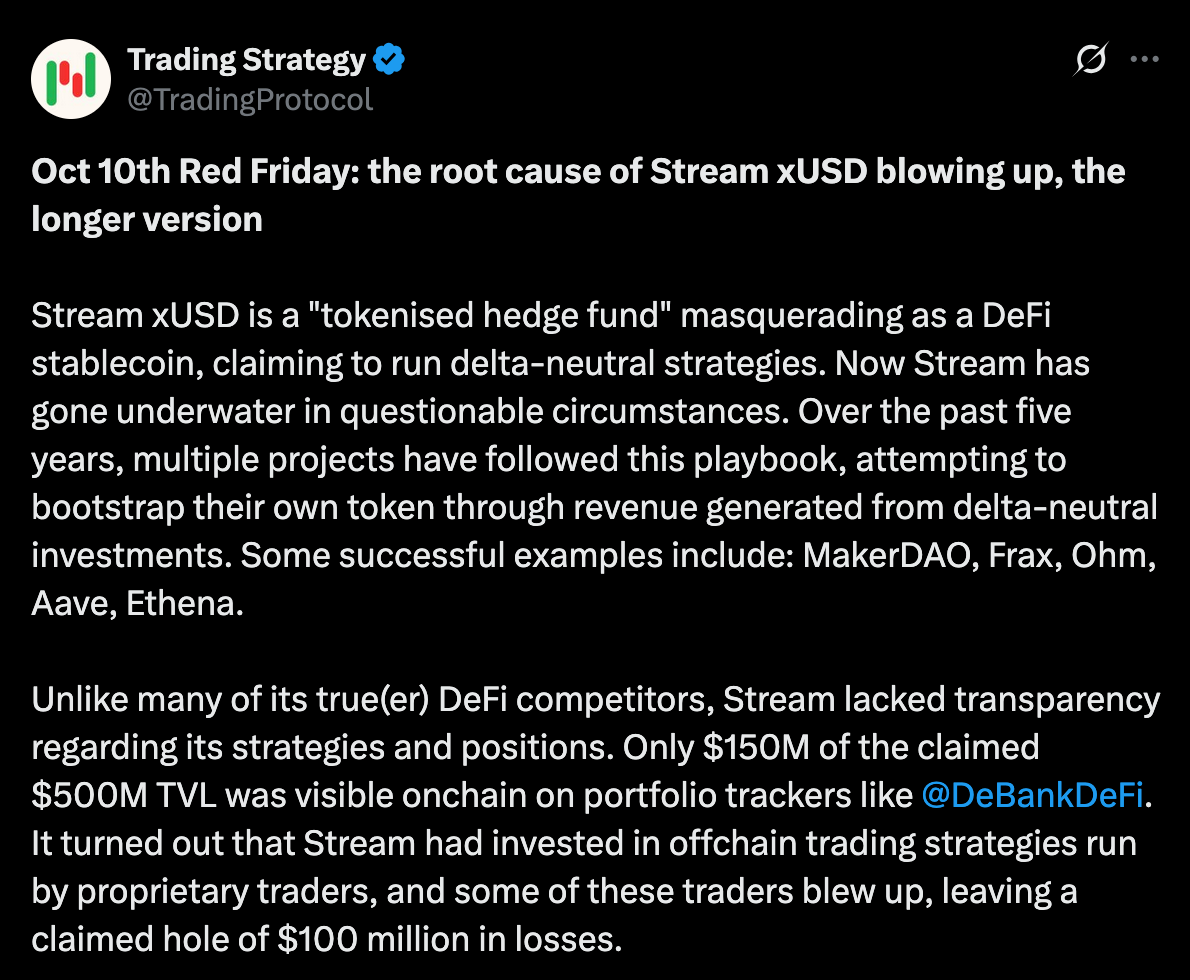 Stream was opaque, highly levered via looping with Elixir, and running proprietary options strategies on centralised exchanges. The blowup was the direct result of the October 10th liquidation event, when all cryptocurrencies fell sharply. This caused $150M in known losses, but probably more due to leverage, exposure, and contagion across multiple lending protocol vaults.