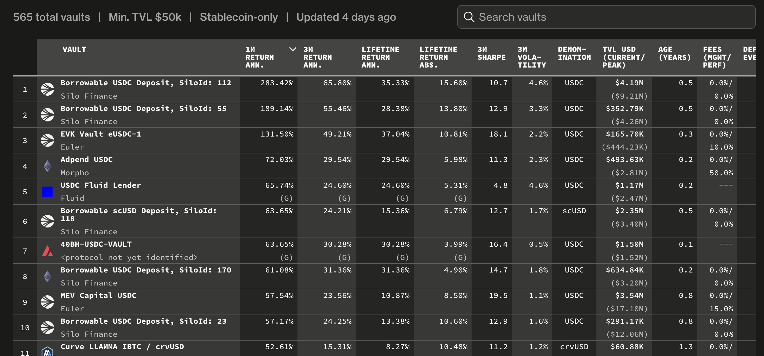 - Vaults categorised by protocol, age, TVL, depositor counts: small new vaults and large established ones